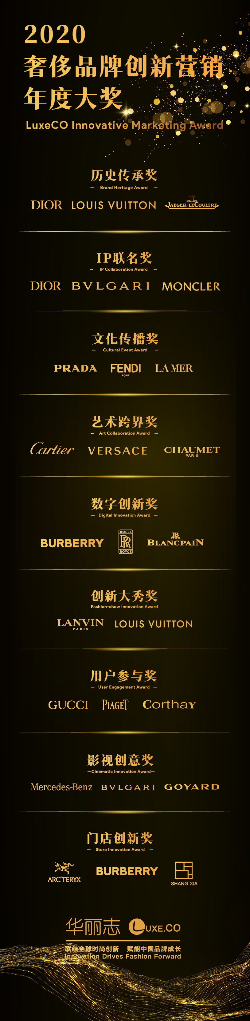 华丽志“2020年度奢侈品牌创新营销大奖”设置的9个细分奖项,代表着奢侈品牌在中国市场开展创新营销的最重要的9个方向,相信通过了解获奖品牌的创新实践,能给广大的品牌经营管理者、创业者和跨界学习者提供丰富的灵感源泉和行动参考。