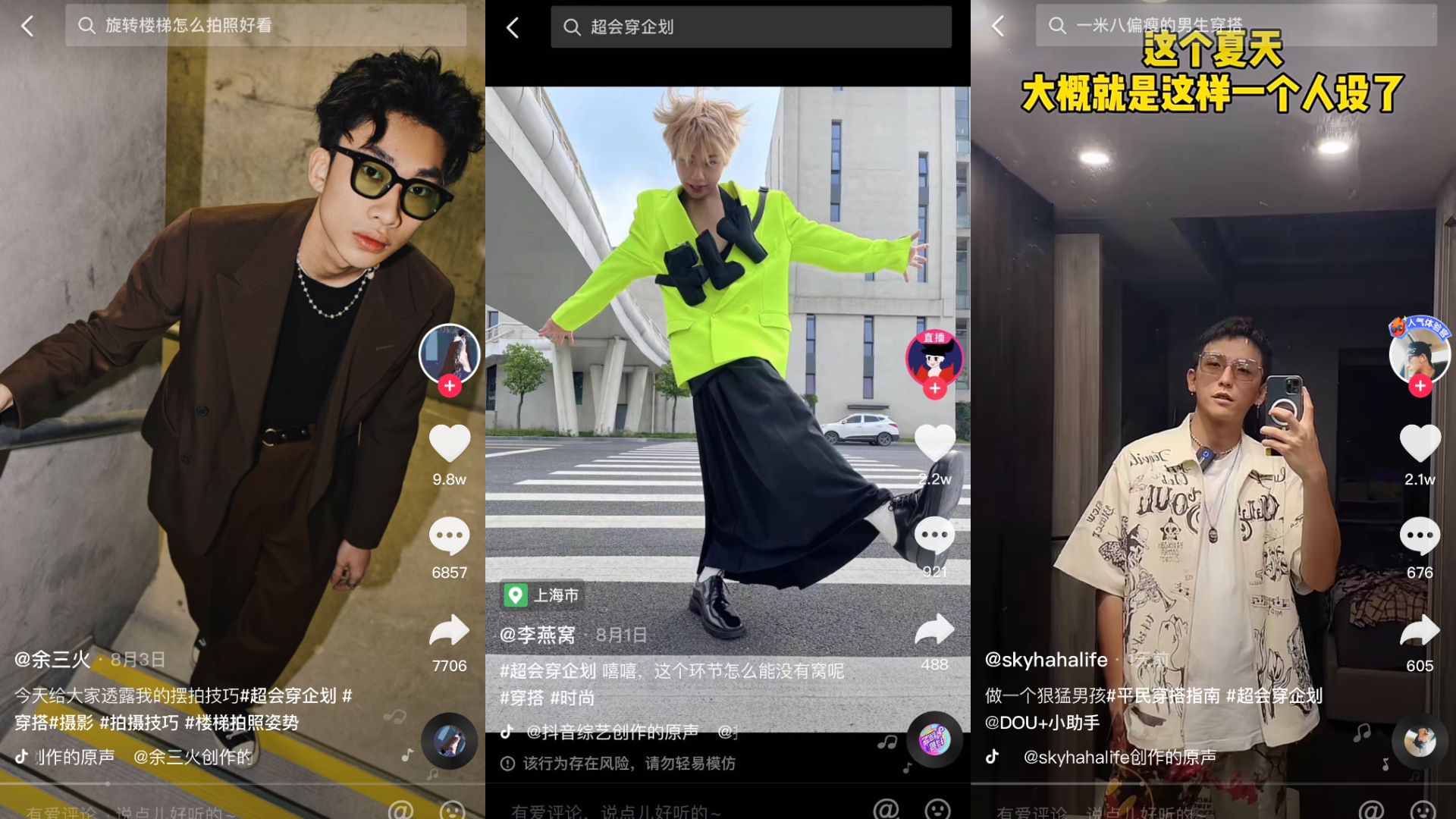 7月底,抖音开展了针对高调性穿搭达人的专项计划——“超会穿企划”,无论是时尚小白,OOTD爱好者,还是资深潮人,只要对“穿搭”有自己的想法,都可以参与。