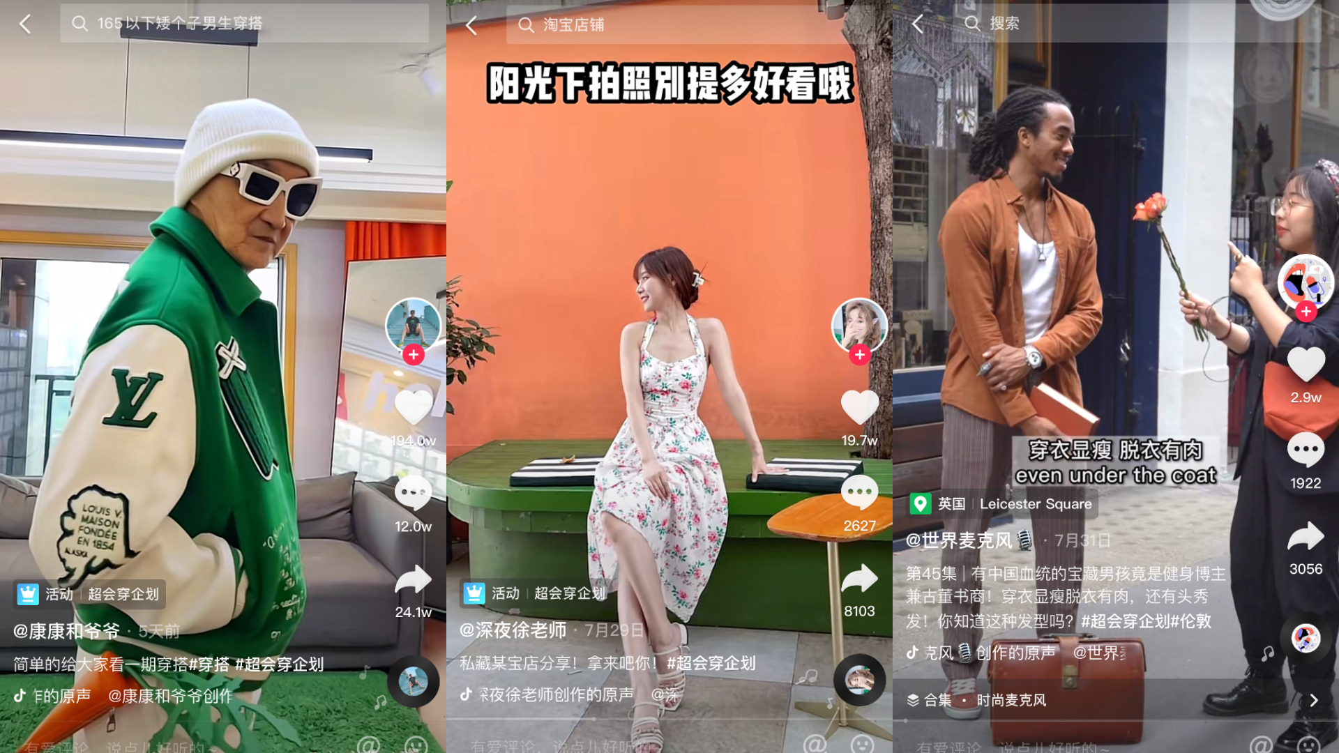 以西装、复古为个人标签,在墨尔本留学的“余三火”,分享了男生夏日穿搭,以及在楼梯间拍大片的姿势要领;年逾80岁,依旧身材挺拔,走路带风的“康康和爷爷”穿上了最新的路易威登,三天内收获了150多万点赞和10多万条评论,不少网友评论“最潮爷爷”、“LV代言人”;