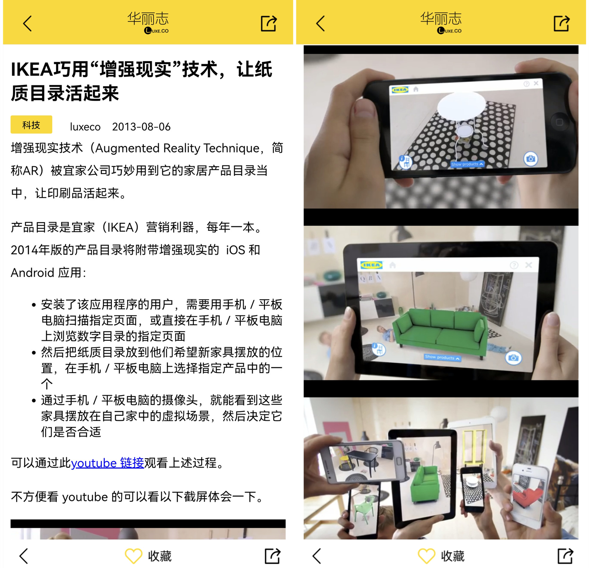 上图:2013年,宜家通过AR技术让纸质目录上的家居“跃然于屋中”。
