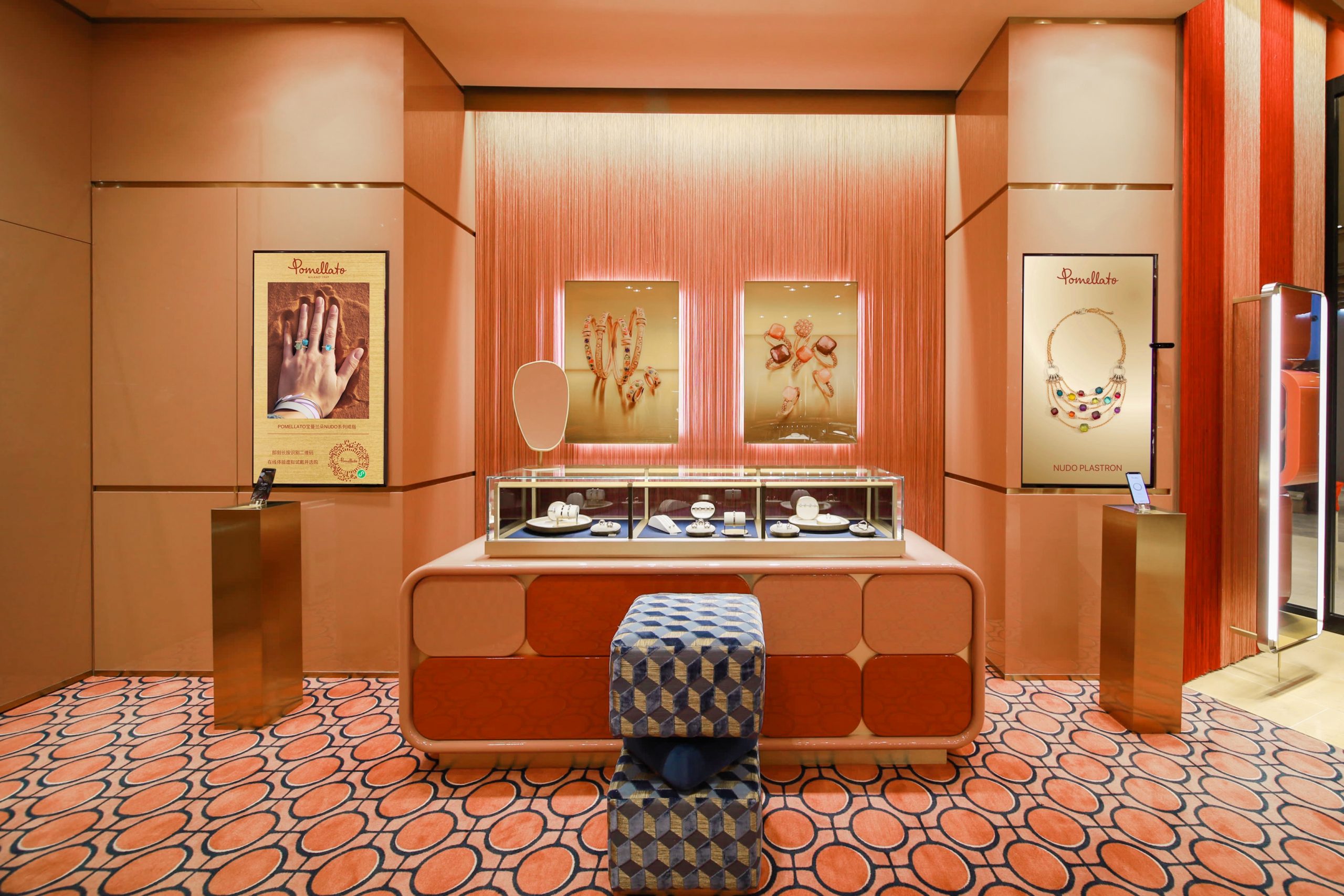 或许是这一虚拟试戴体验在线上获得了不错的反馈,Pomellato宝曼兰朵在刚刚开业的上海前滩太古里精品店引入了首个线下AR试戴体验区,并首次提供品牌高级珠宝产品的虚拟试戴。