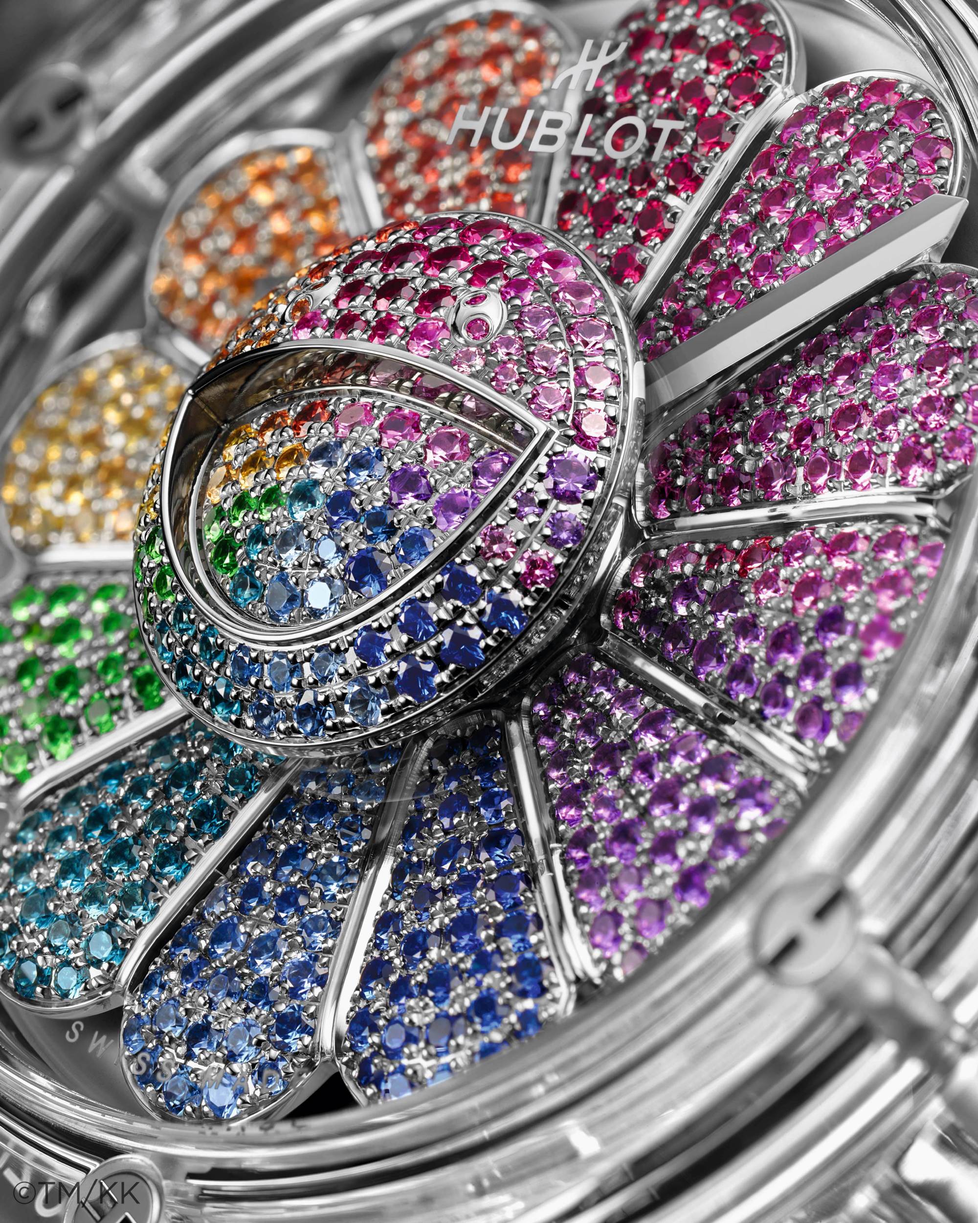 蓝宝石材质因为透明度高、坚固耐用的特点深受年轻表迷喜爱。在2021年宇舶表与村上隆两度联名的合作款,均采用了蓝宝石制作表壳和表背,以清晰地展示腕表表盘和机芯的精湛细节。值得一提的是,同年4月,宇舶表还推出了首款采用一体式结构设计的 Big Bang Integral一体式陀飞轮全透明蓝宝石腕表。