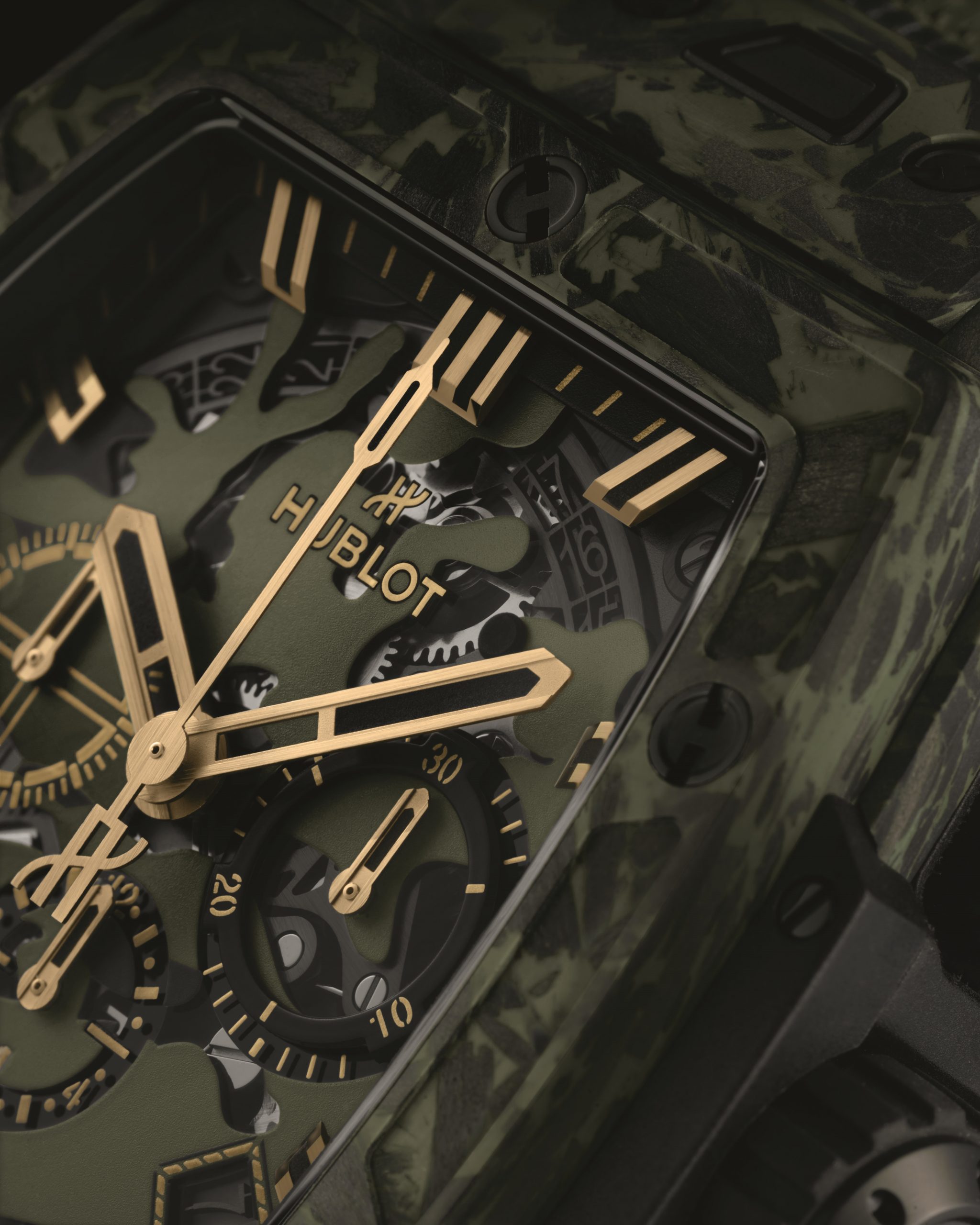 此次推出的 BIG BANG灵魂绿色碳纤维迷彩腕表采用了宇舶表的又一突破性创新材料——加入了玻璃纤维的碳纤维,在保持碳纤维轻盈优势的同时,增加了材料的强度和韧性。