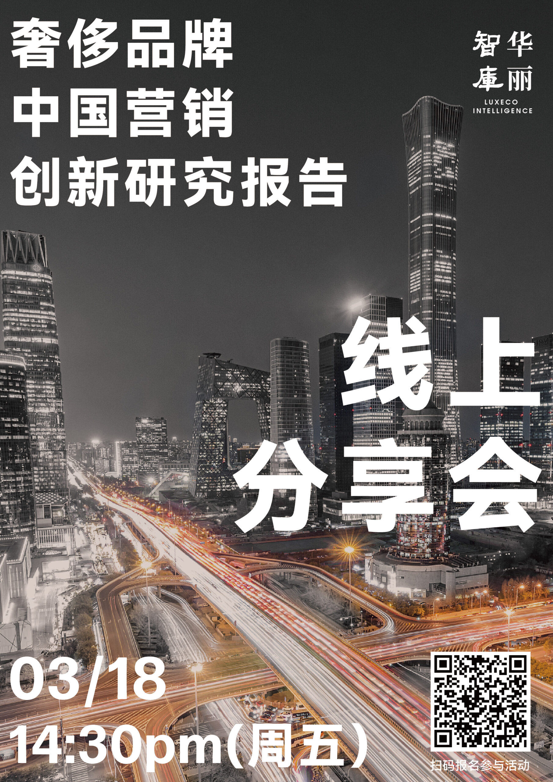 为了探讨未来奢侈品牌在中国市场面临的机遇与挑战,挖掘品牌们在中国创新营销的真正机会,【华丽智库】定于本周五3月18日下午14:30 举办线上分享会,首次公开披露榜单前30名,并详细解读“奢侈品牌中国营销创新研究报告”的精华内容。