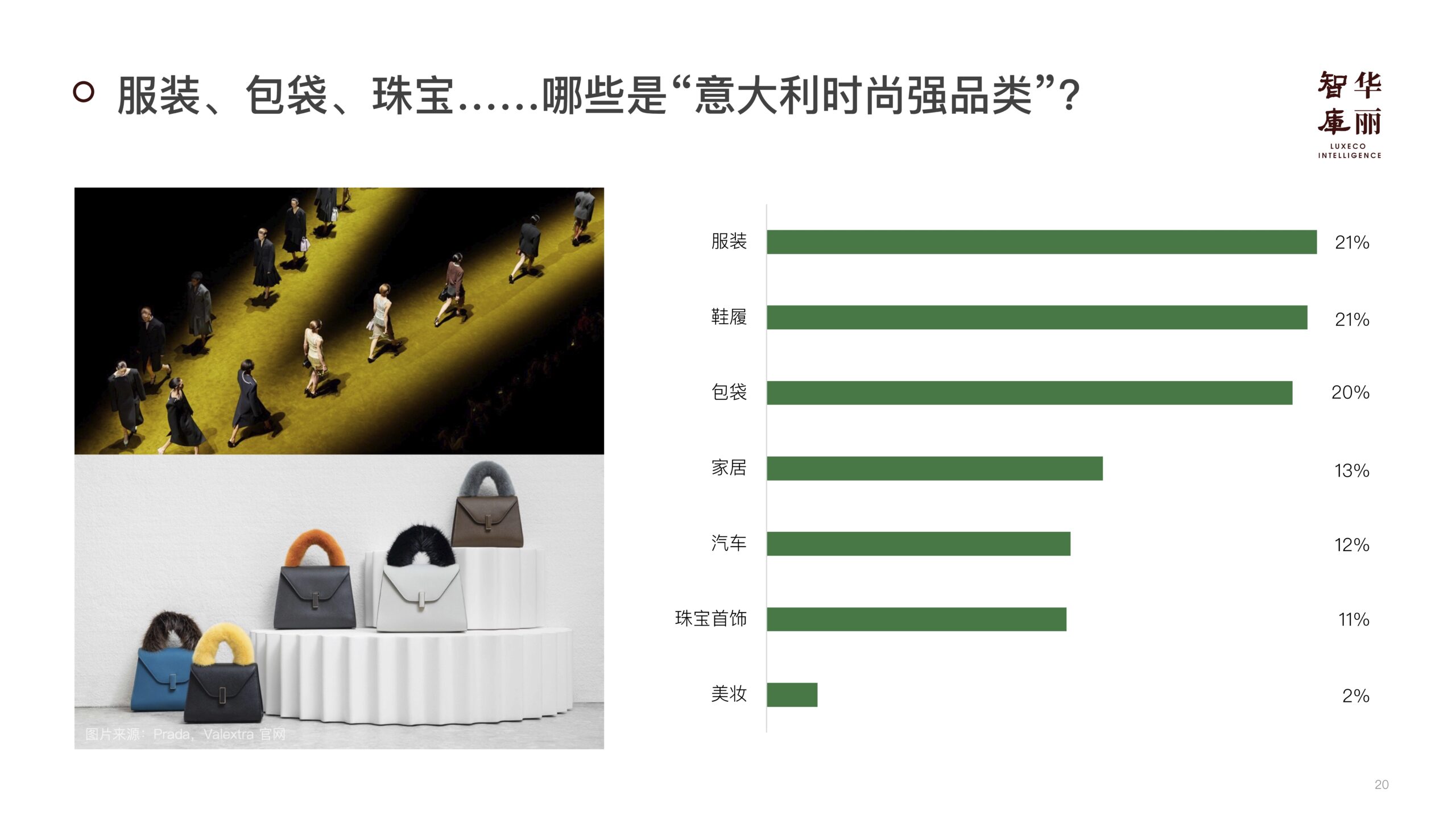 3)服装、鞋履、包袋是中国消费者心目中的意大利时尚产业三大强势品类。