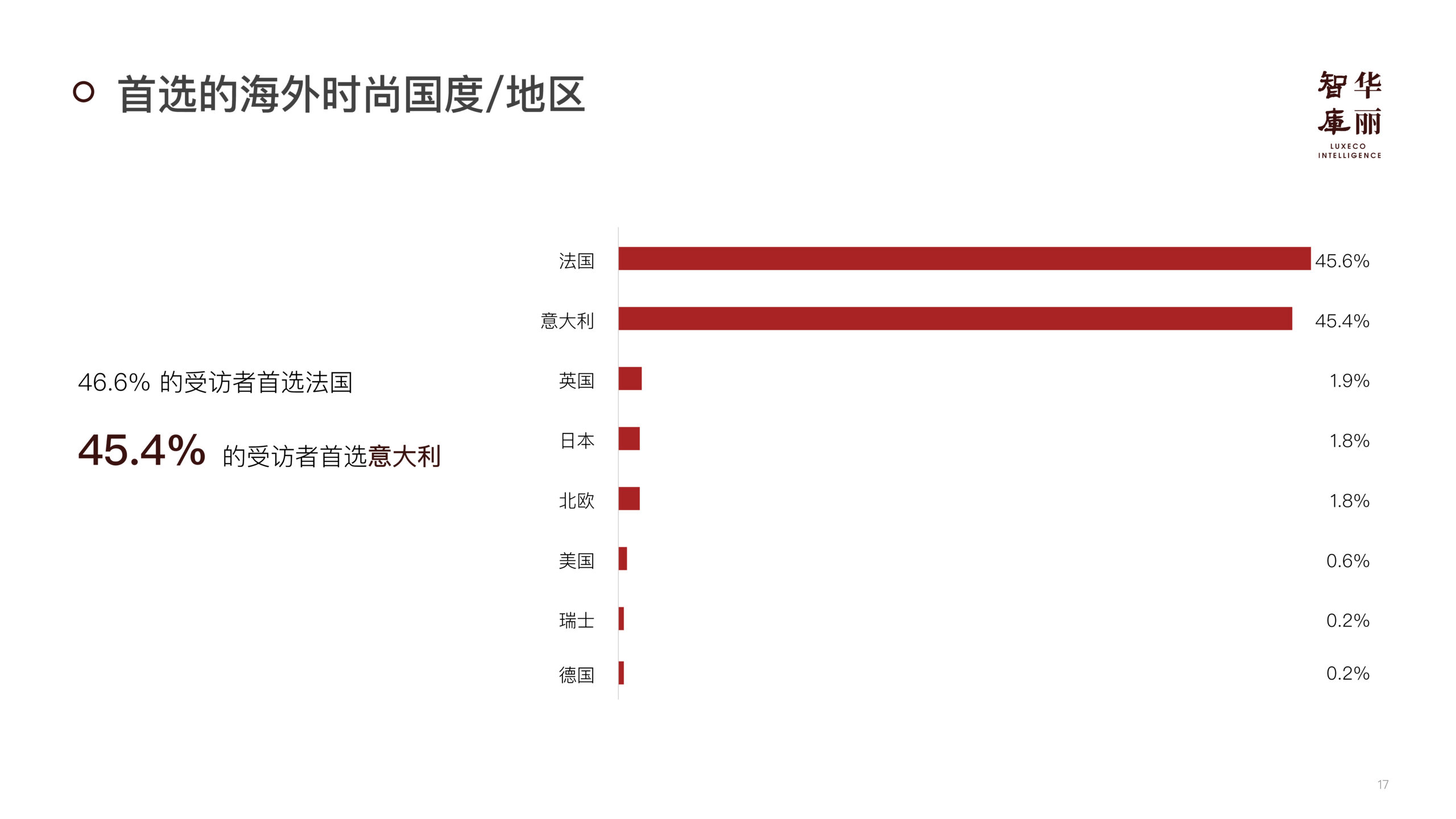 1)意大利是45.4%华丽智库受访者首选的“时尚国度”。相比2018年调研,这一比例有所下滑(从60%到45.4%),并且略低于法国(46.6%)。我们认为,意大利时尚品牌在传播和推广方面还有较大的提升空间,以加强中国新一代消费者对品牌的认知度和忠诚度。