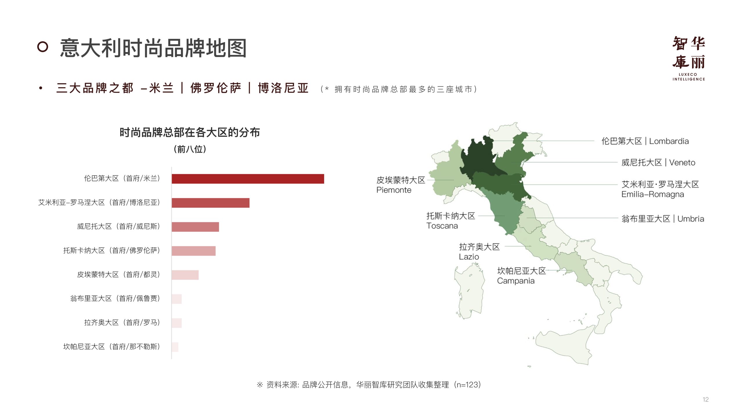 - 分布在意大利伦巴第、艾米利亚-罗马涅、威尼托、托斯卡纳、皮埃蒙特、翁布里亚等14个大区;其中,米兰、佛罗伦萨、博洛尼亚是拥有时尚品牌总部最多的三座意大利城市。