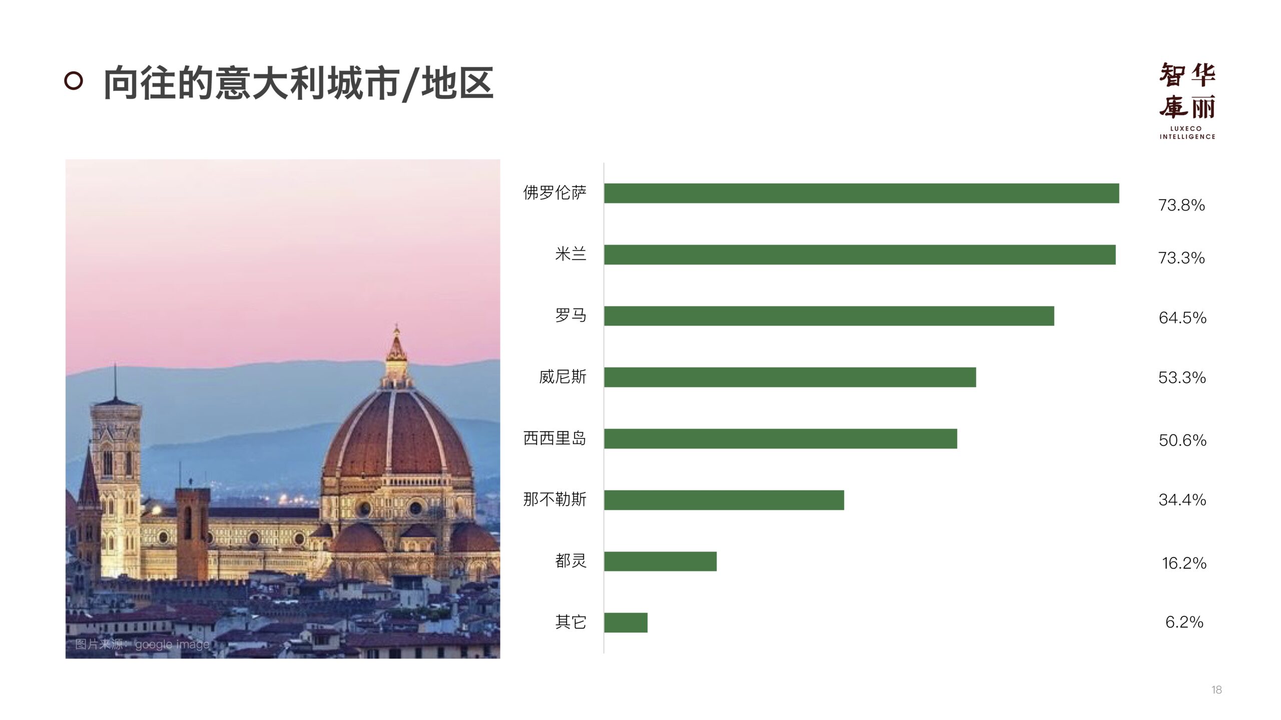 2)对中国消费者来说,意大利的魅力不仅来源于时尚和奢侈品,各具特色的意大利城市和丰富多彩的展会活动都令人向往。