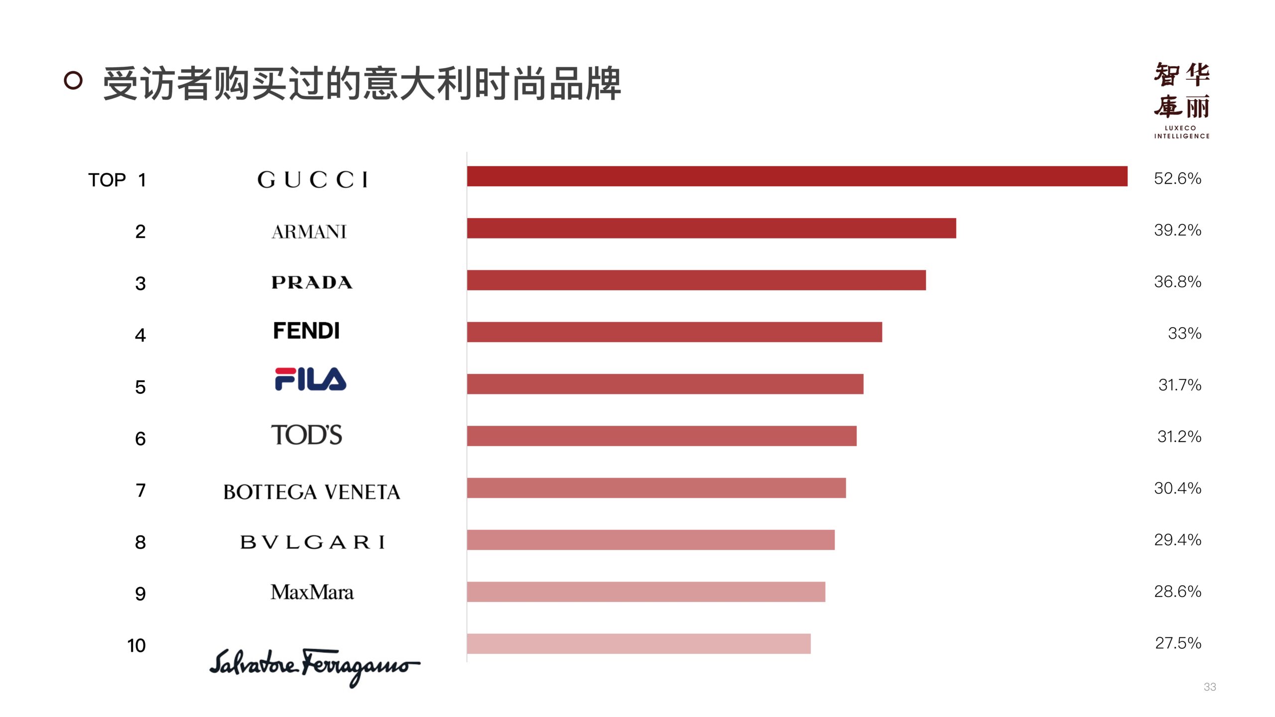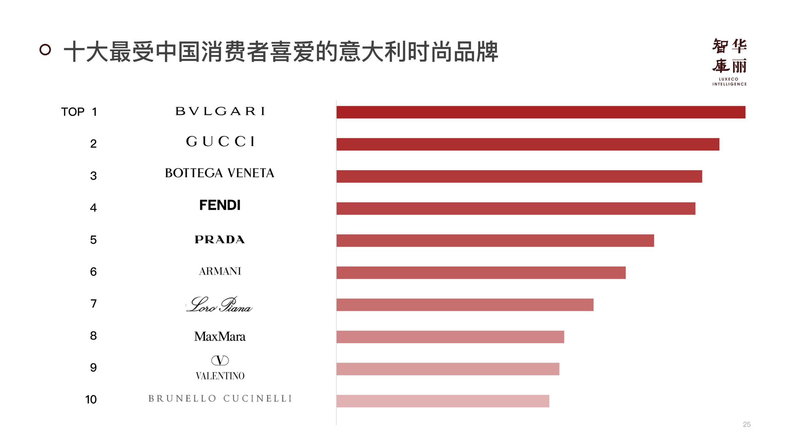 5)BVLGARI、Gucci、Bottega Veneta、Fendi、Prada、Armani、LoroPiana、Max Mara、Valentino、Brunello Cucinelli 是最受中国消费者喜爱的10大品牌。