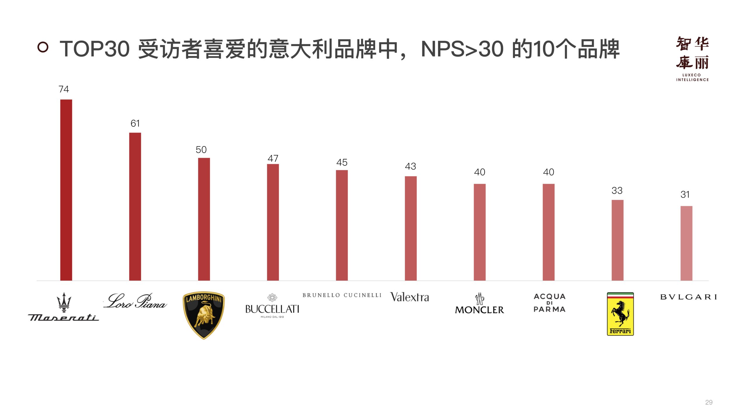 6)通过“NPS(净推荐值)”调研,我们发现,在最受喜爱的TOP30品牌里,Maserati、Loro Piana、Lamborghini、Buccellati、Brunello Cucinelli、Valextra、Moncler、Acqua Di Parma、Ferrari、BVLGARI 是推荐度和忠诚度最高的10大品牌。
