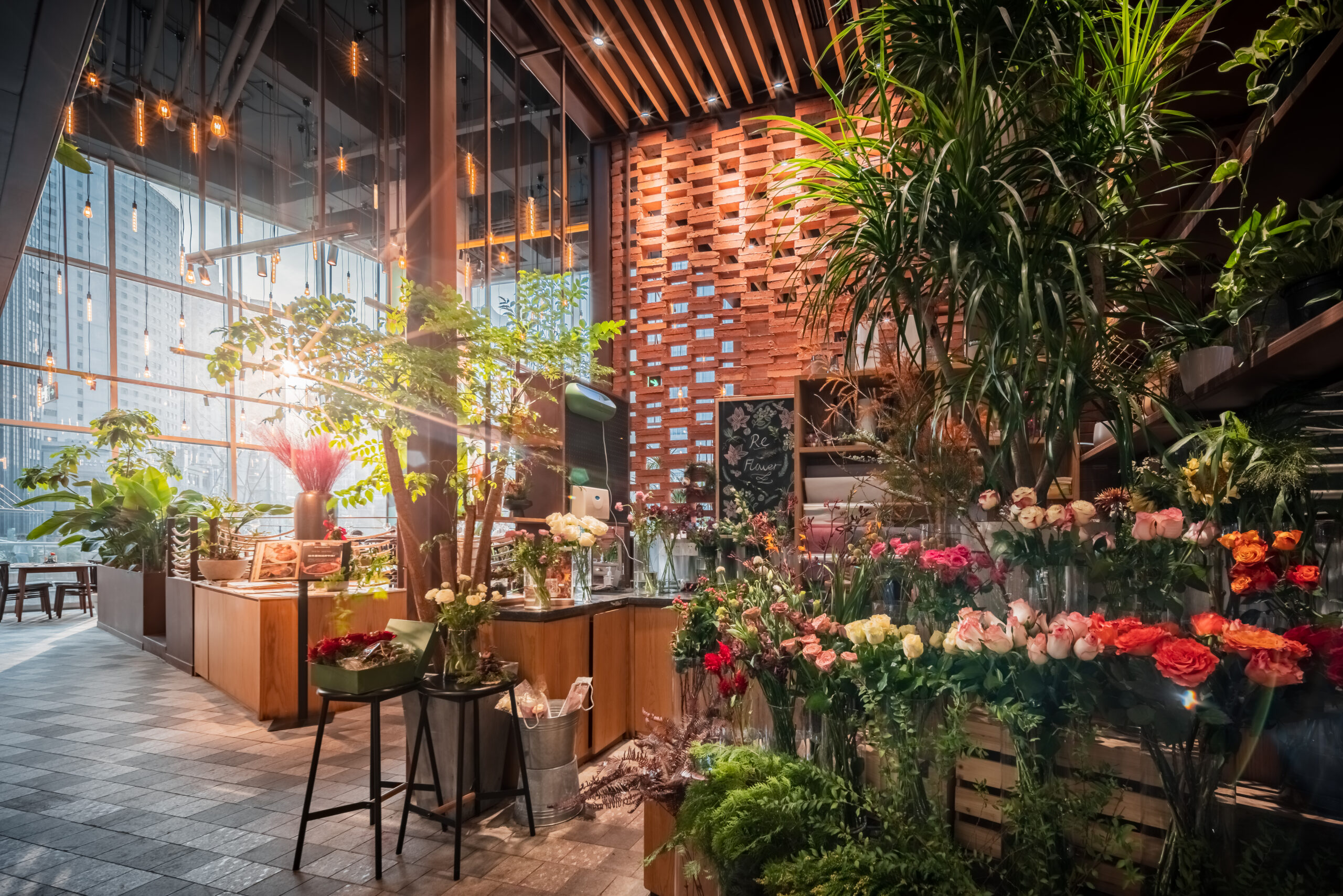 RE而意的门店内,有自行车,有骑行服饰和装备,更有鲜花与绿植,餐厅与酒吧。