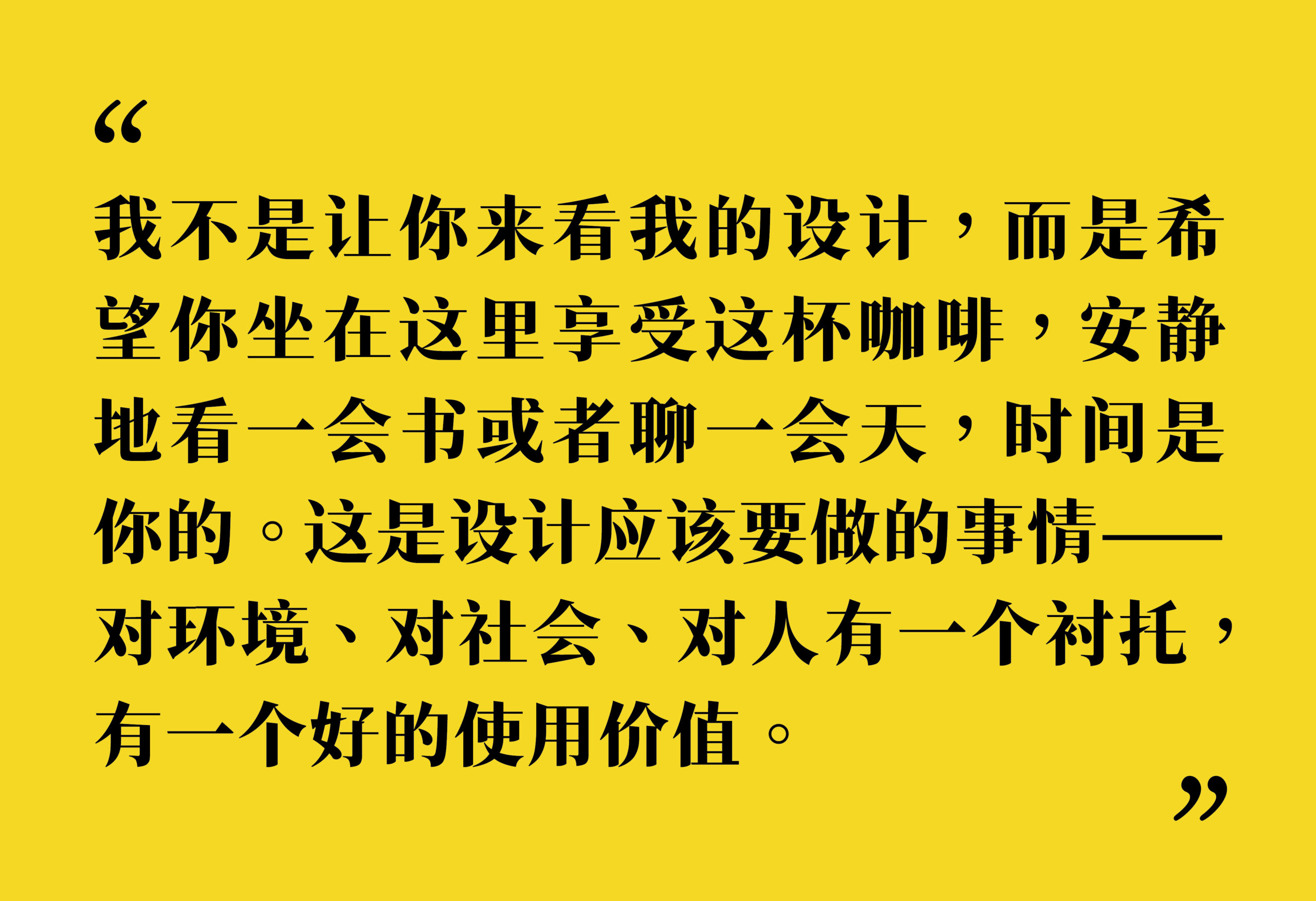 我不是让你来看我的设计,我是希望你坐在这里享受这杯咖啡,安静的看一会书或者聊一会天,时间是你的。这是设计应该要做到的事情——对环境、对社会、对人有一个衬托,有一个好的使用价值。