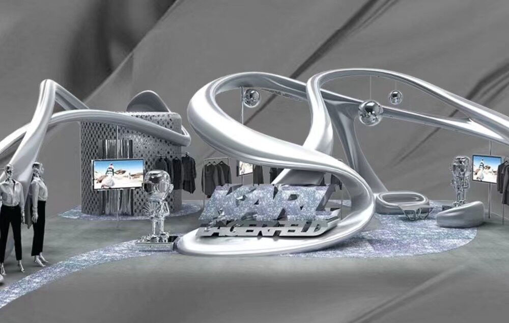 我们的消博会展馆主打未来概念,以“未来之城”为主题,从浩瀚宇宙和科幻故事的意象中汲取灵感,通过液态金属造型打造流动线条,构筑 KARL LAGERFELD 摩登多元的超现实空间(下图)。