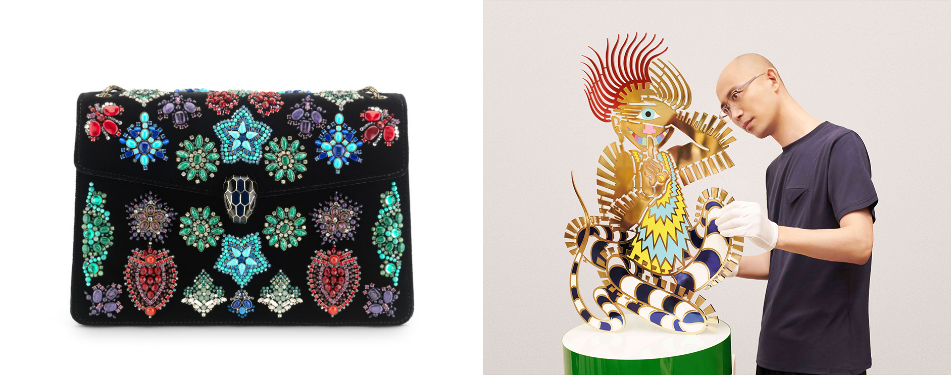 上图:当代艺术家邬建安将宝格丽Serpenti Forever Bejewelled Velvet珠宝包袋繁复、多彩的美学内化,创作出金属镂刻雕塑作品《烛龙》。