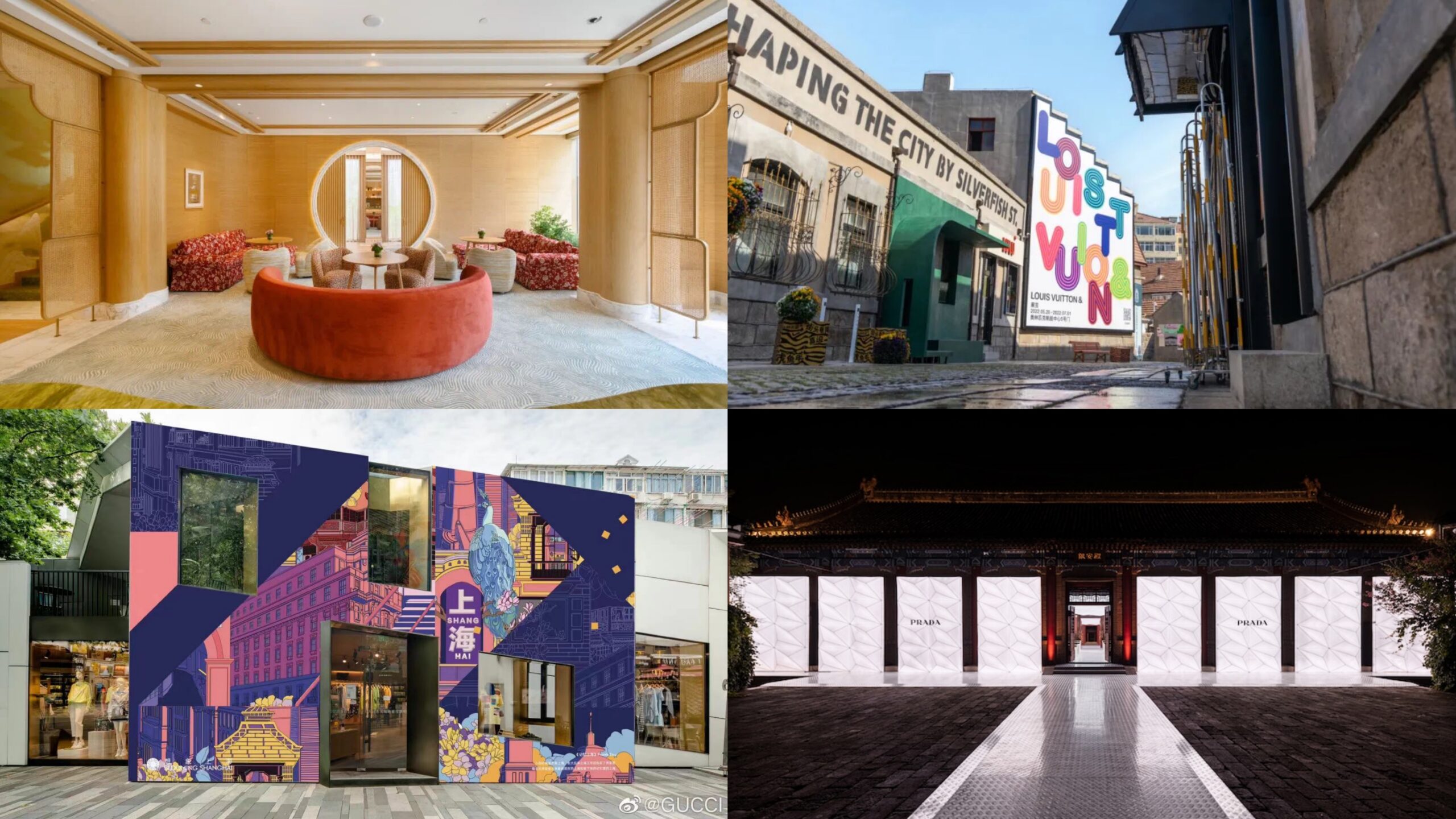 上图依次为:Cartier 成都远洋太古里精品店茶室;LOUIS VUITTON&青岛展览;Gucci “想象上海BloomingShanghai”艺术创作征集企划优胜创作《记忆上海》;Prada 北京2022秋冬大秀