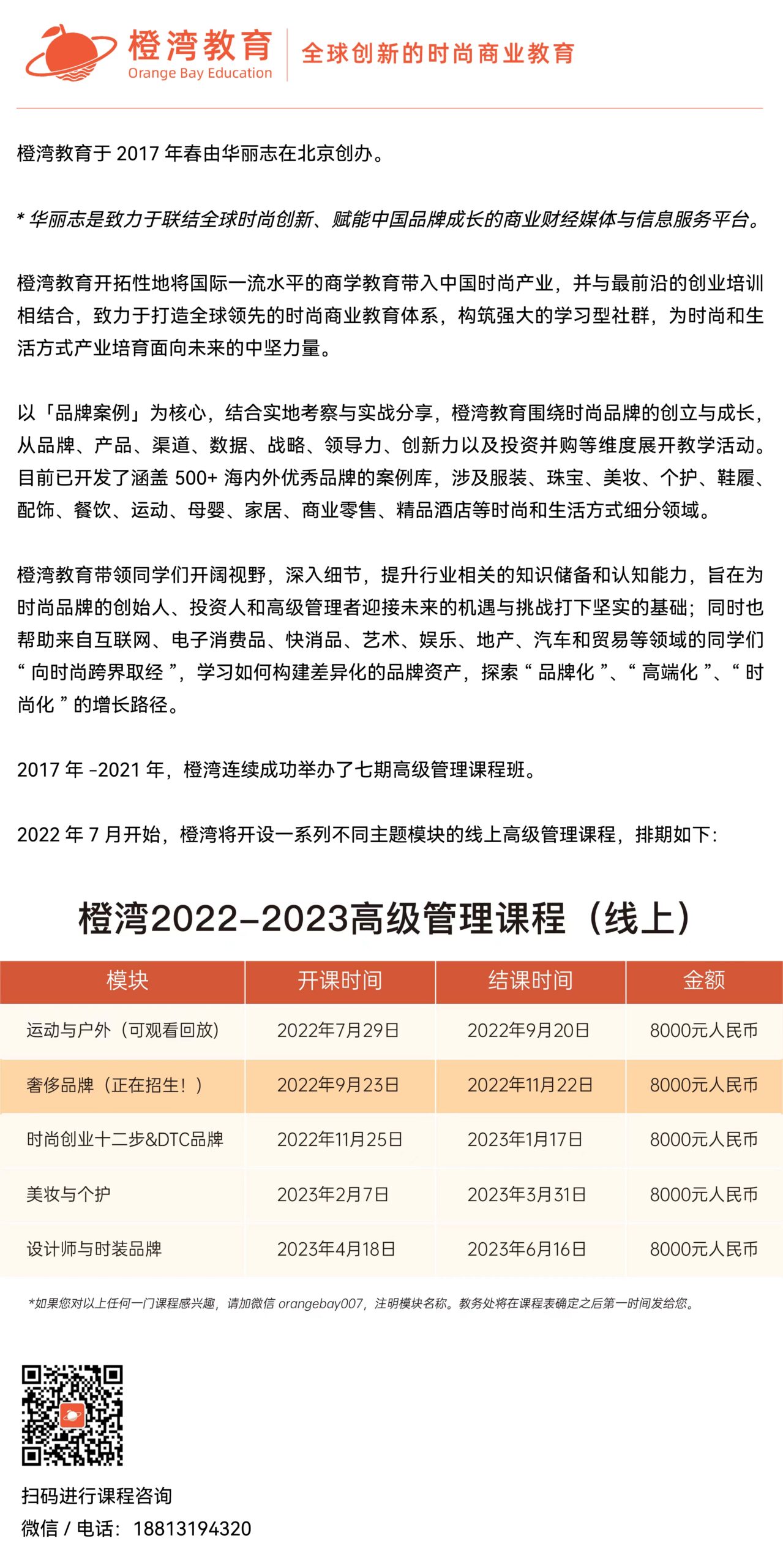 9月23日,橙湾「奢侈品牌」高级管理课程(线上)正式开课!课程包括 12堂奢侈品牌案例课程(包括新兴中国奢侈品牌)、4堂奢侈品行业概论讲座—— 理论与实践密切结合,深入浅出,层层递进。目前报名的同学来自海内外不同城市,包括服装、美妆、珠宝企业的创始人,以及奢侈品牌的高管等。