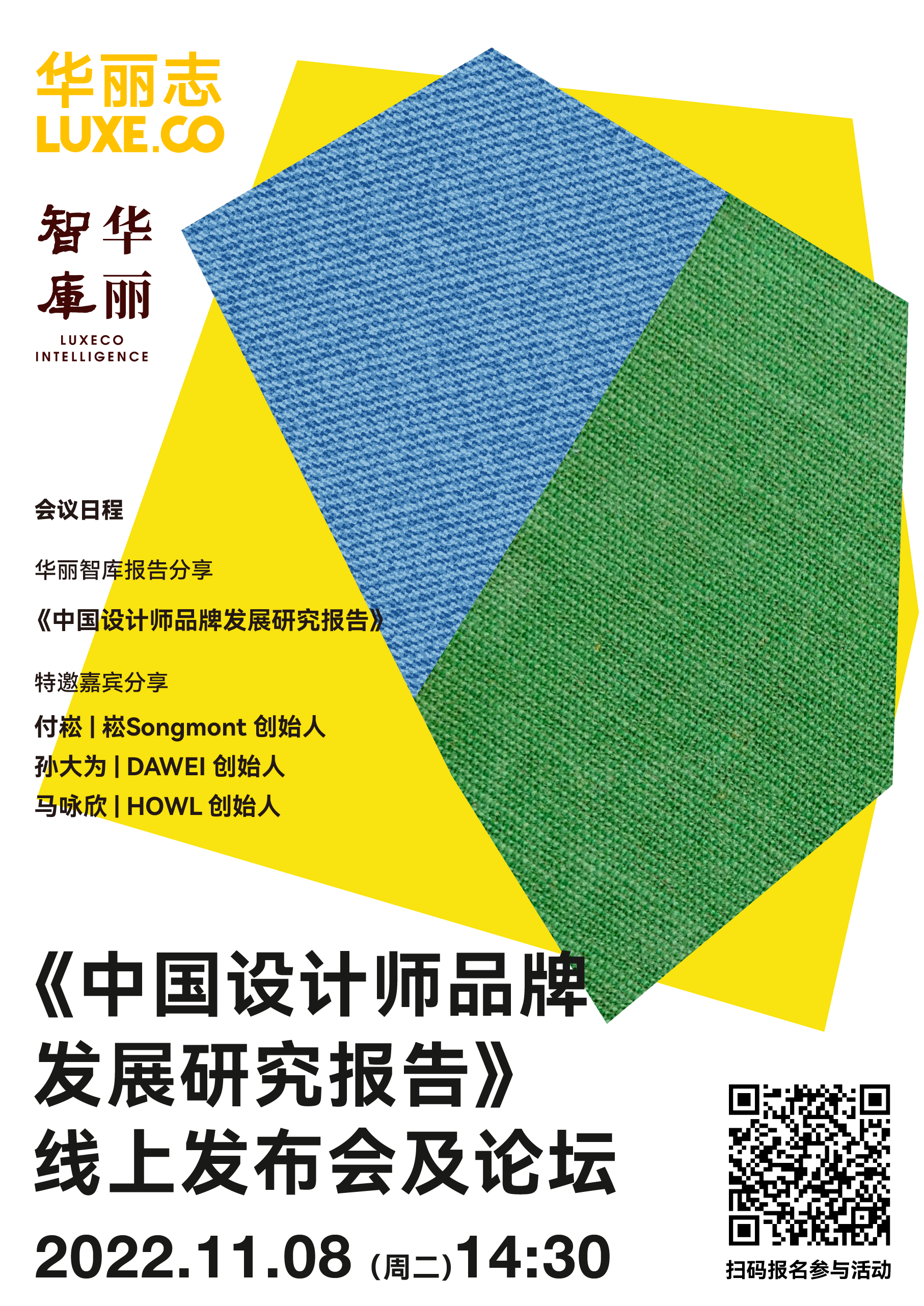 基于此,「华丽智库」撰写了2022年版《中国设计师品牌发展研究报告》,将于11月8日(周二)下午14:30 在线正式发布。届时将围绕设计师品牌线下门店拓展、营销传播、跨界合作、消费者洞察和行业趋势等话题,全面呈现设计师们所面临的机遇与挑战,并与业内嘉宾展开深入讨论。(点击此处,报名参与活动)