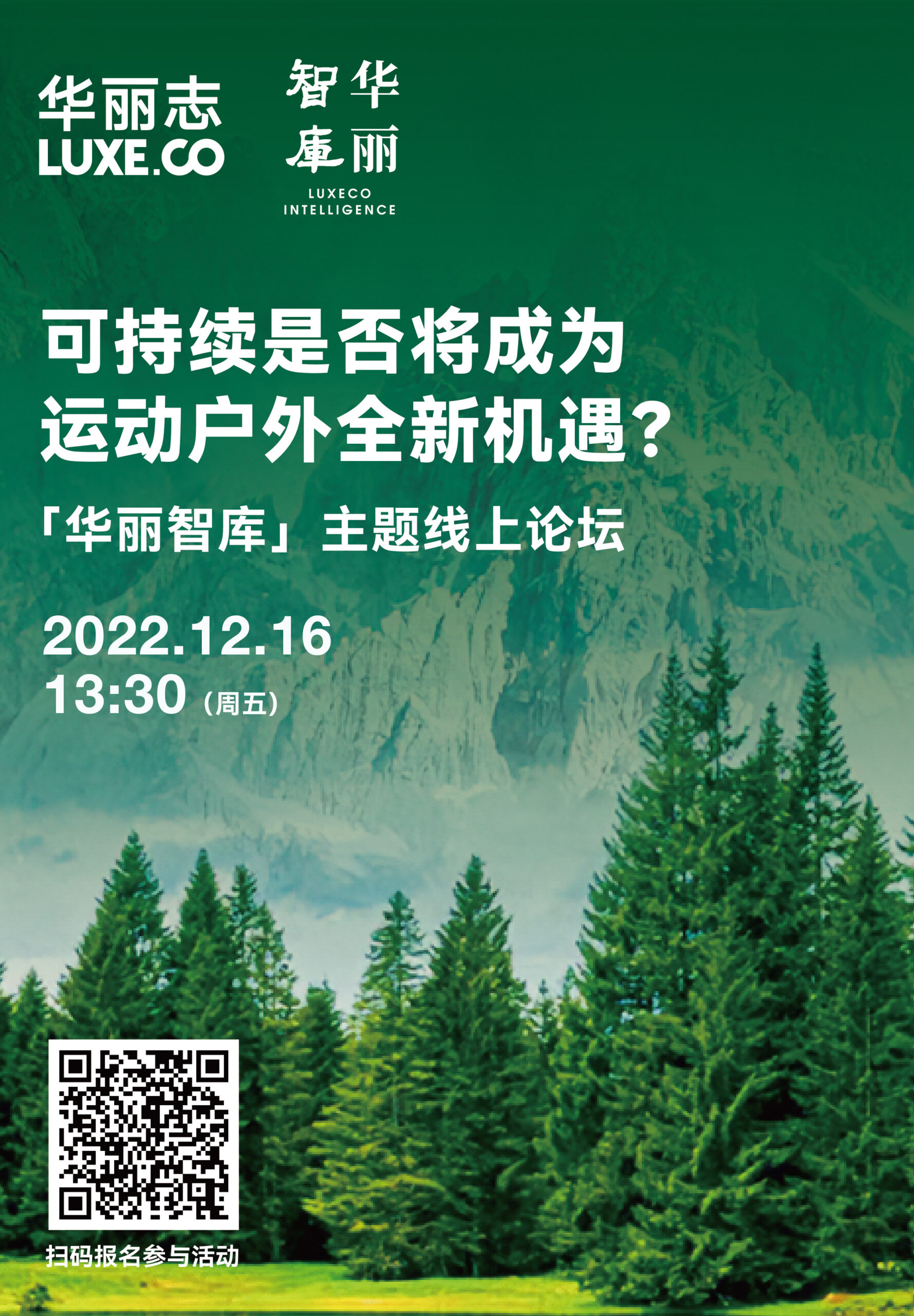 12月16日,华丽志旗下时尚产业研究机构「华丽智库」将举办“可持续是否将成为运动户外全新机遇?”主题线上论坛活动。