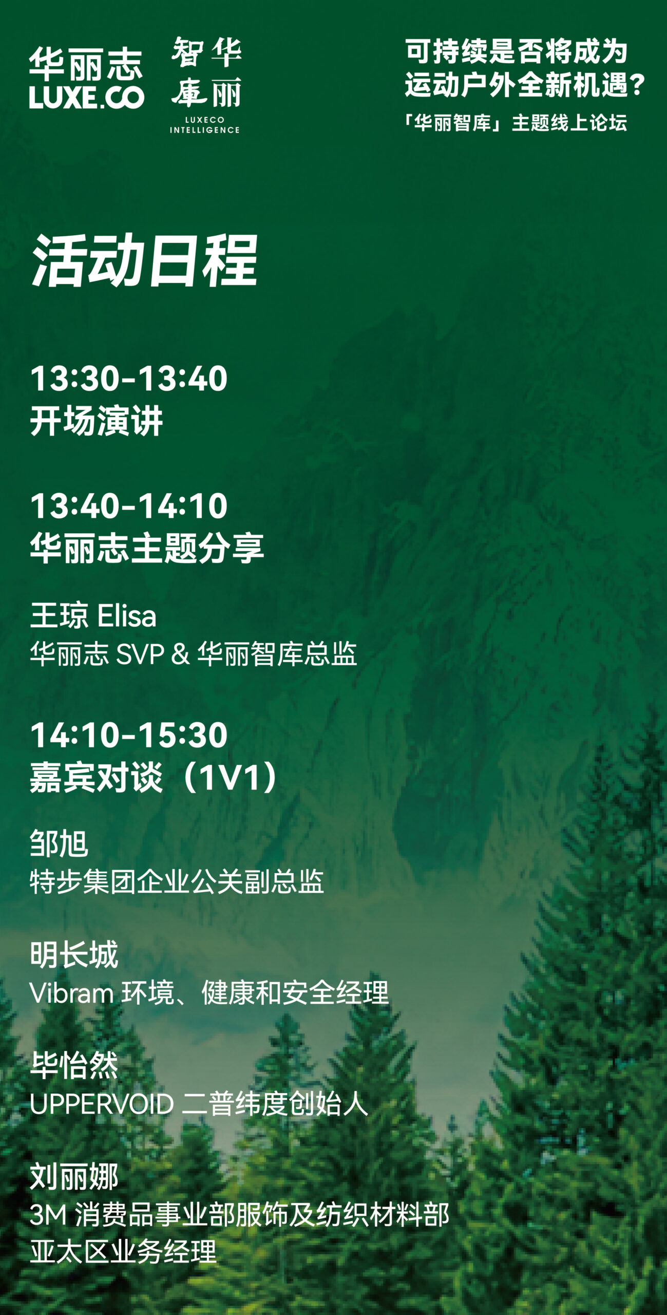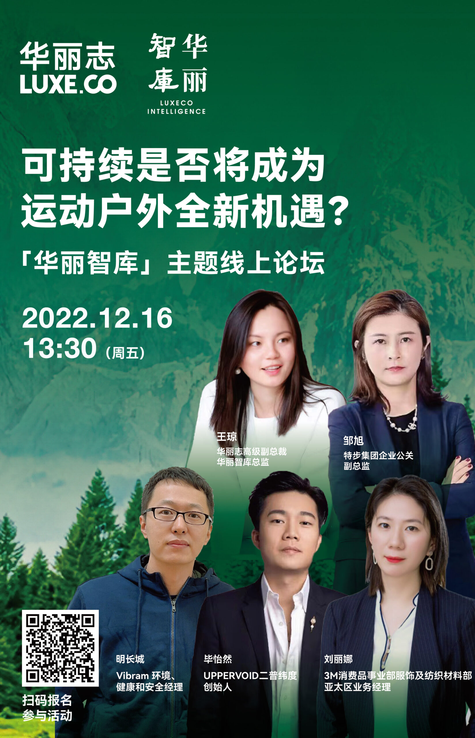 12月16日,华丽志旗下时尚产业研究机构「华丽智库」将举办“可持续是否将成为运动户外全新机遇?”主题线上论坛活动。最终嘉宾阵容及时间正式揭晓!