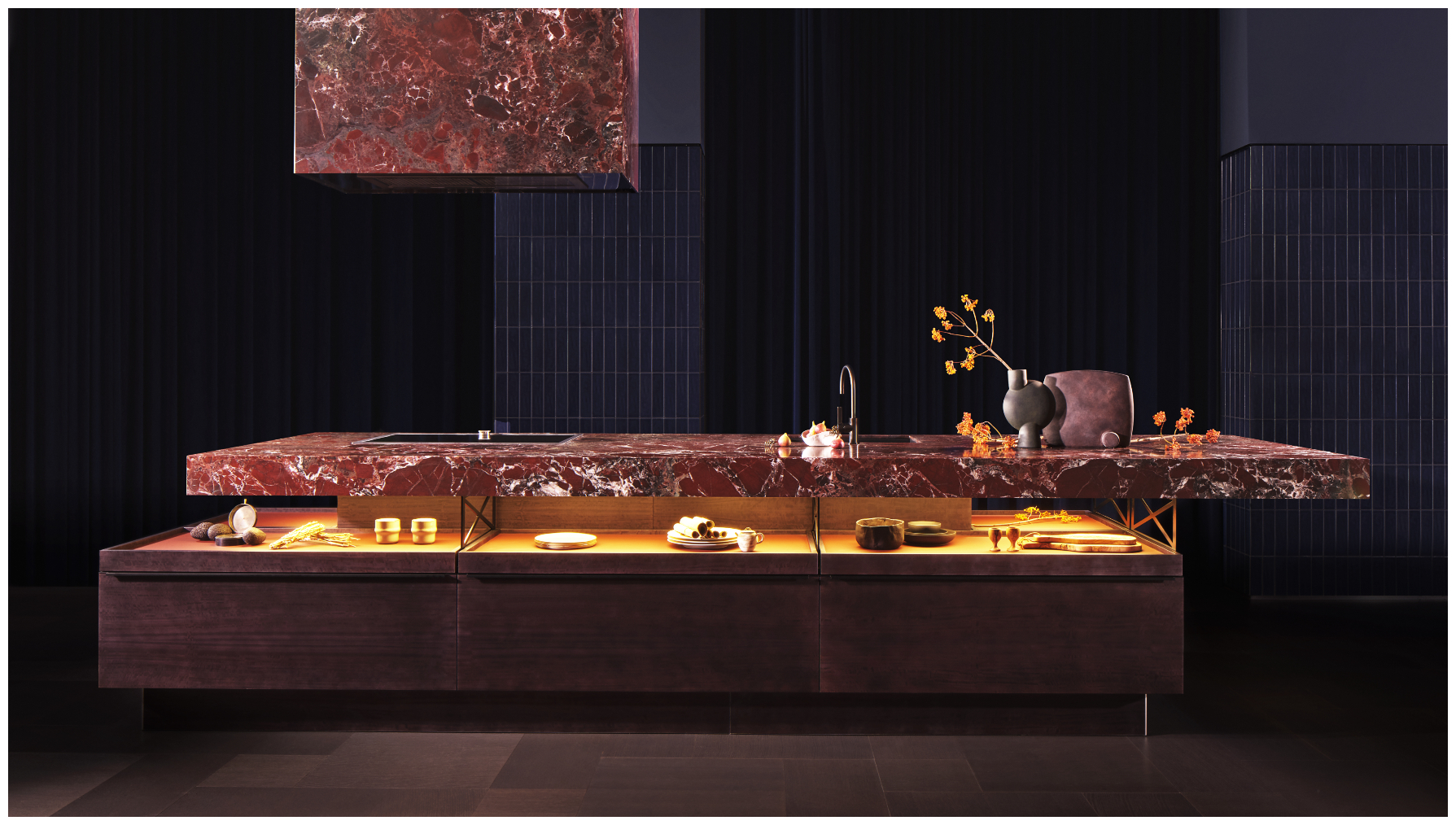上图:+MODO 系列展示区域。厨房中岛是标志性的 +MODO 紫罗红大理石操作台面,辅以底柜和开放式置物架,抽屉滑轨边距精确到毫米计算。