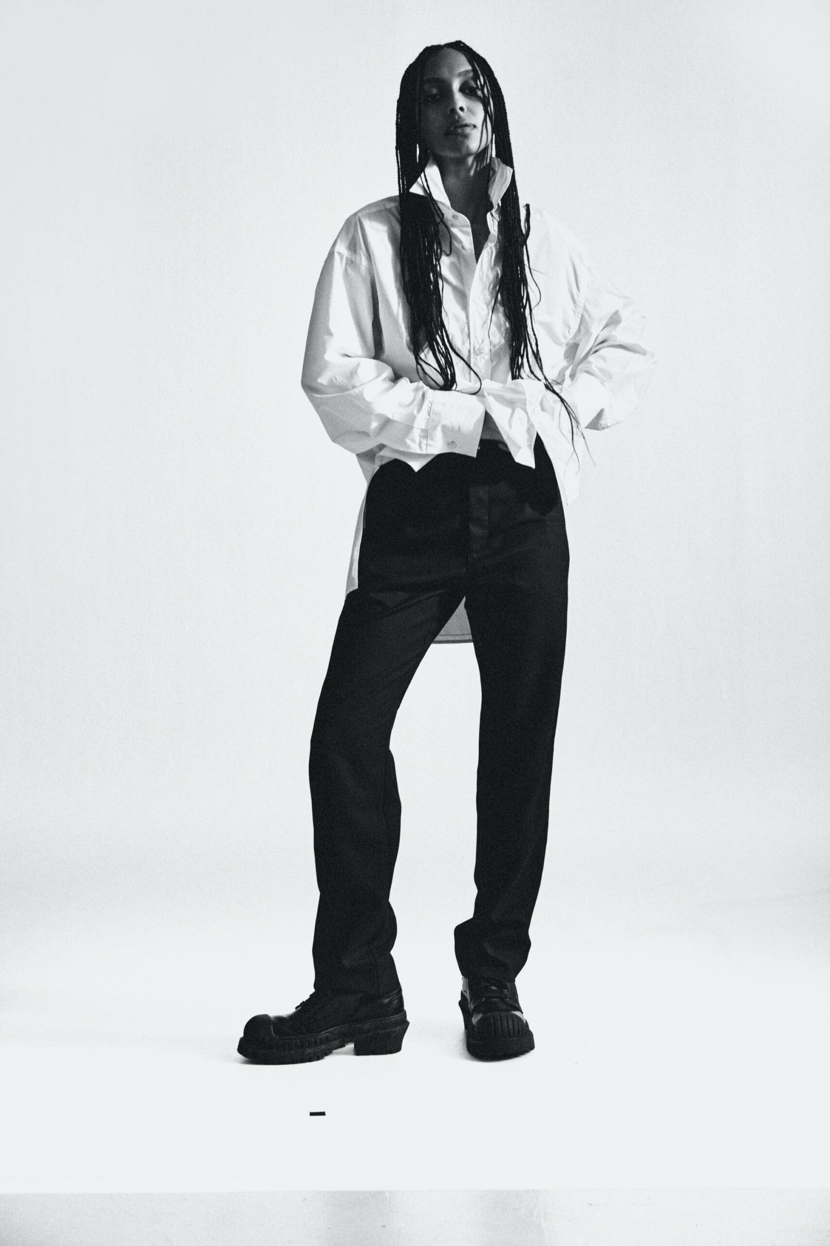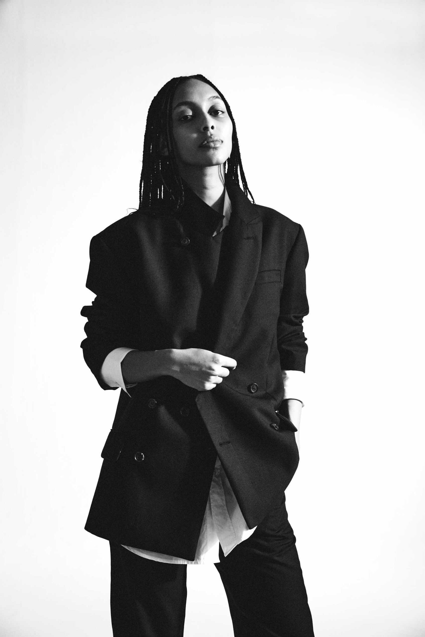 Adnym 的最新系列 SMOKE BLACK 以黑白为主色调,采用羊毛混纺斜纹面料,颇有技术感,全年皆可穿着。系列包括品牌独创的宽松褶皱裤(上图)、常规的直筒裤、直筒剪裁和开腰设计的 oversized 西装外套(下图)、大领口宽门襟的 oversized 衬衫等产品,都展现了 Adnym 的品牌 DNA。