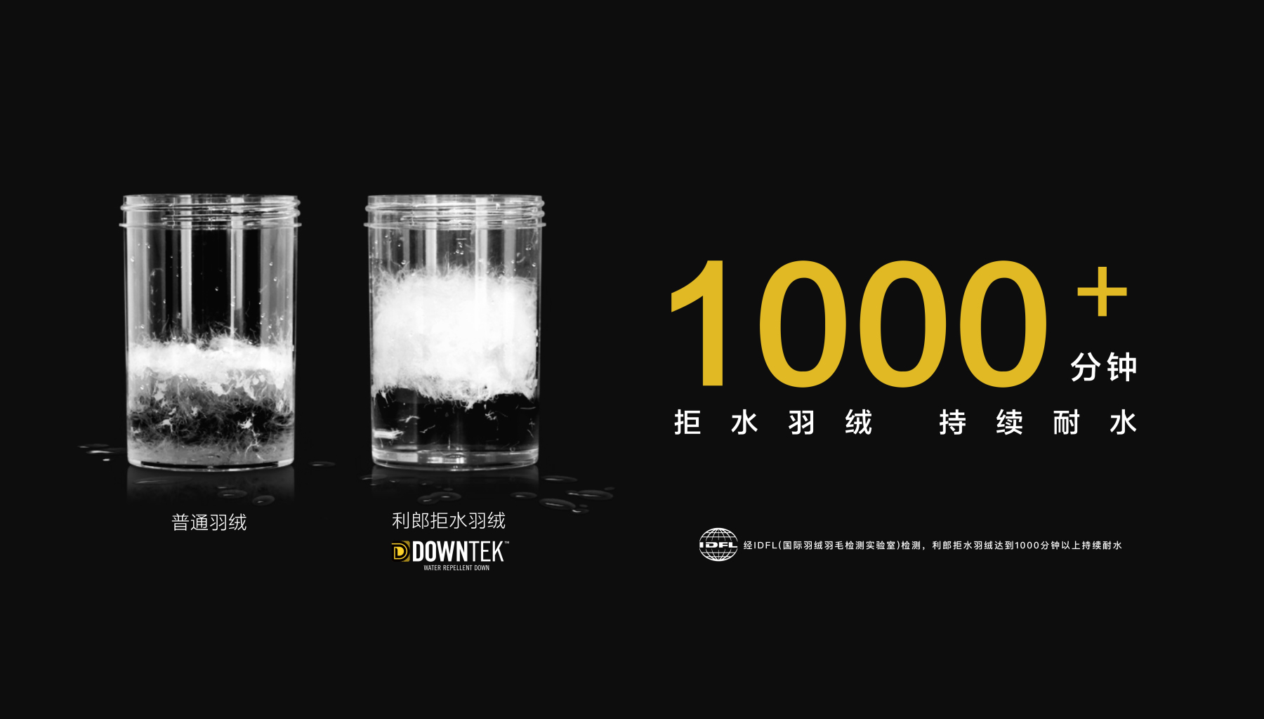 利郎拒水羽绒采用合隆的非氟碳系拒水绒 Downtek PFC free™,羽绒表面经过DWR工艺进行防水处理,在 IDFL(国际羽绒羽毛实验室)的震荡测试中取得了超过1000分钟5级长效拒水的优异成绩(测试中,羽绒的拒水时间超过40分钟就可称为拒水羽绒)。