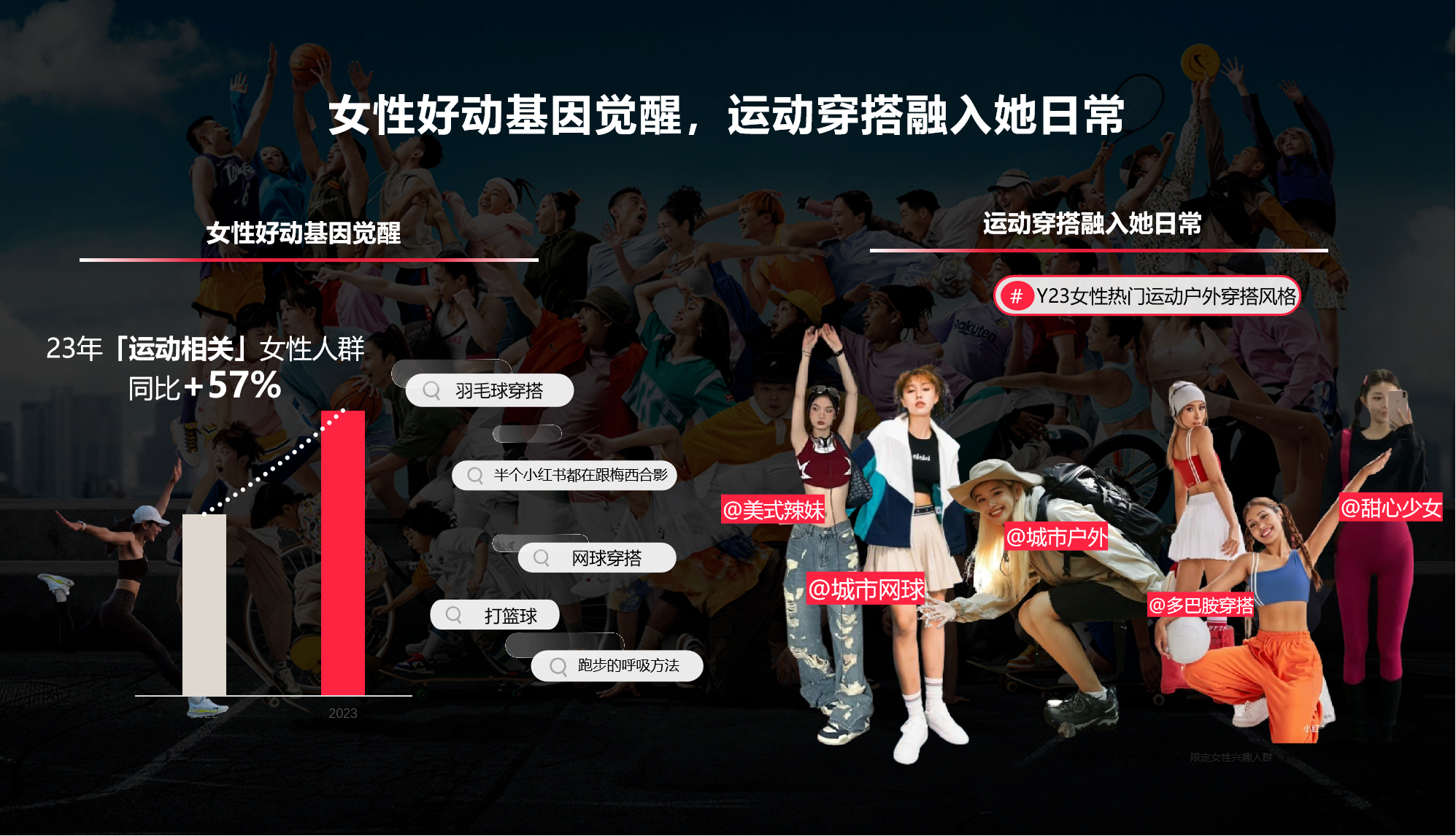 女性的运动参与度越来越高。据小红书数据,2023年,运动相关女性人群上涨了57%,展现出小红书提出的“她动能美学”的增长潜力。