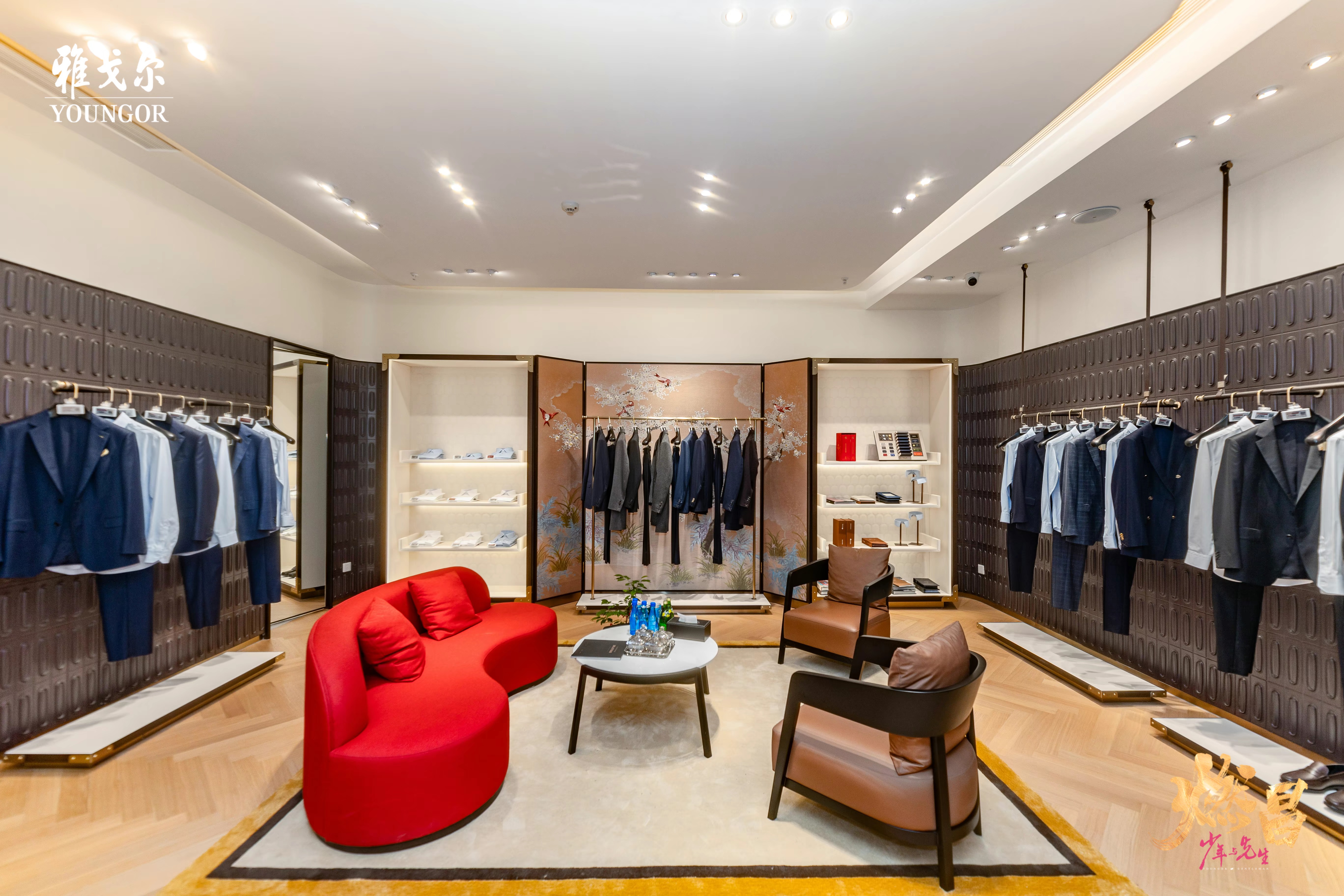 体验馆将二楼向内较为私密的区域留给了 MAYOR 品牌,专门为VIP客户设置了专属空间,沉稳色调与创意屏风延续了 MAYOR 品牌一贯的优雅气质。品牌还特别邀请宁波本地的红帮裁缝到店为顾客提供量体定制服务。