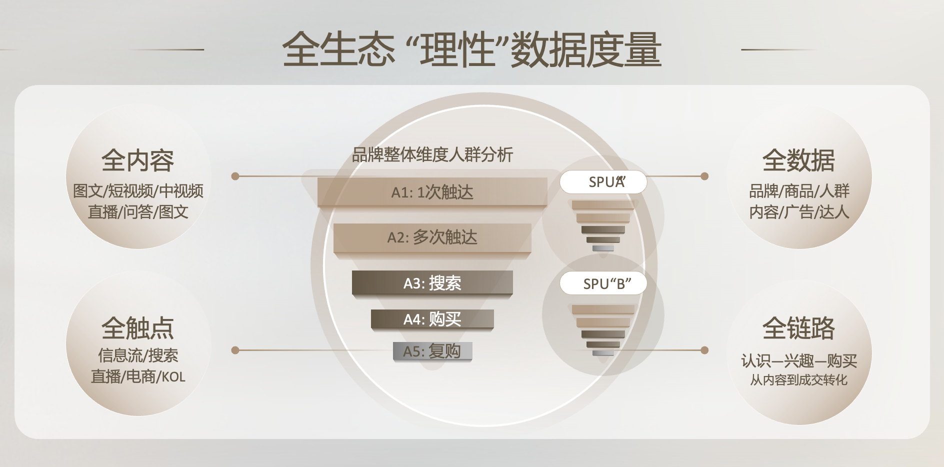 从理性维度出发,将品牌整体维度人群分为5层,依次为1次触达、多次触达、搜索、购买、复购,更为细腻的划分,将给品牌营销更精确的依据。