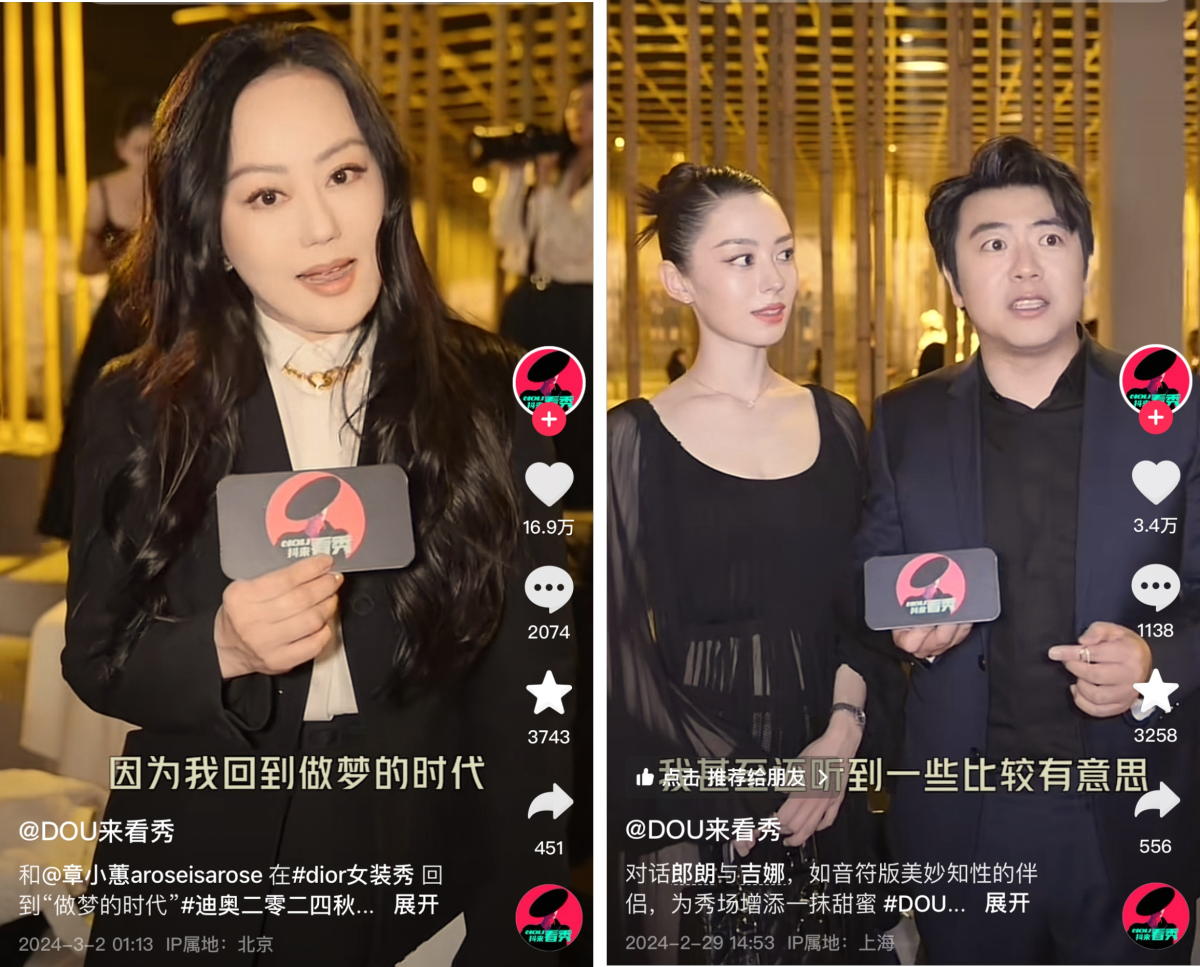 在上半年的巴黎时装周,Dior 携手抖音,与看秀嘉宾郎朗夫妇、章小蕙等开启深度共创。郎朗夫妇从走秀配乐解读秀场内核,章小蕙回顾与Dior的渊源,嘉宾们在各自领域内阐述自己的理解,在T台之下扩充品牌文化。