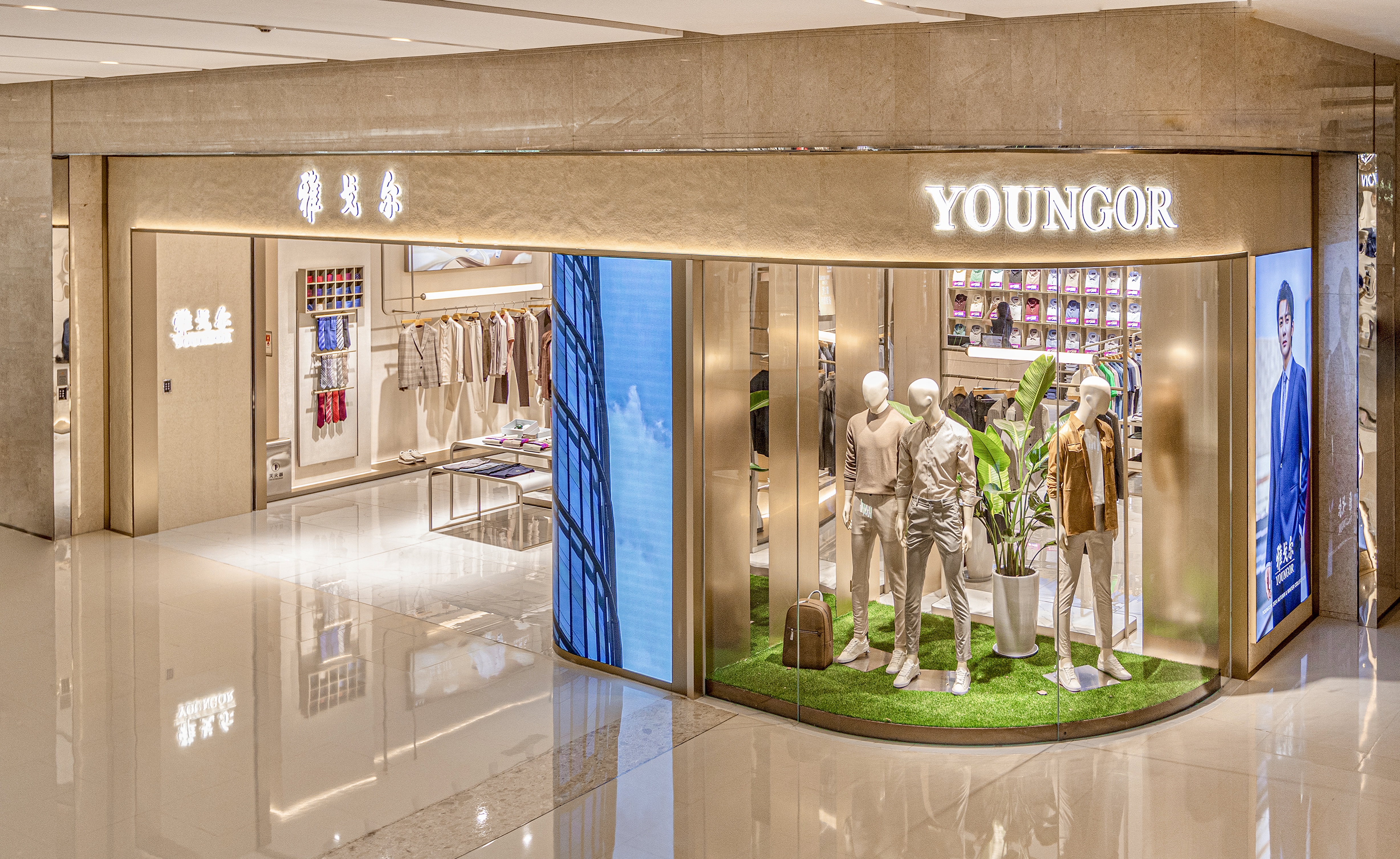 雅戈尔品牌的这家新店坐落在重庆万象城的中区,这个区域主打奢侈品定位,聚集了时尚成衣、包袋鞋履、珠宝腕表品类的30多家国际奢侈品牌。