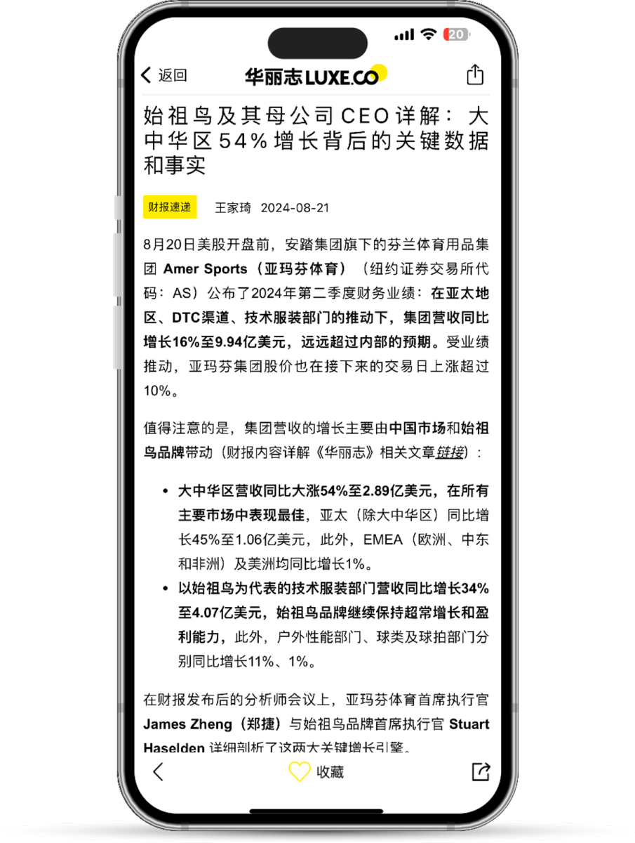 “始祖鸟是亚马芬体育增长最快也是最大的品牌,在所有地区、渠道和品类都实现了健康增长”,在Amer Sports(亚玛芬体育)2024年第二季度财务业绩分析师会议上,首席执行官 James Zheng(郑捷)说道,“始祖鸟在中国市场发挥着明显的领导作用。不仅在细分市场,而且在整个行业都处于领先地位。”