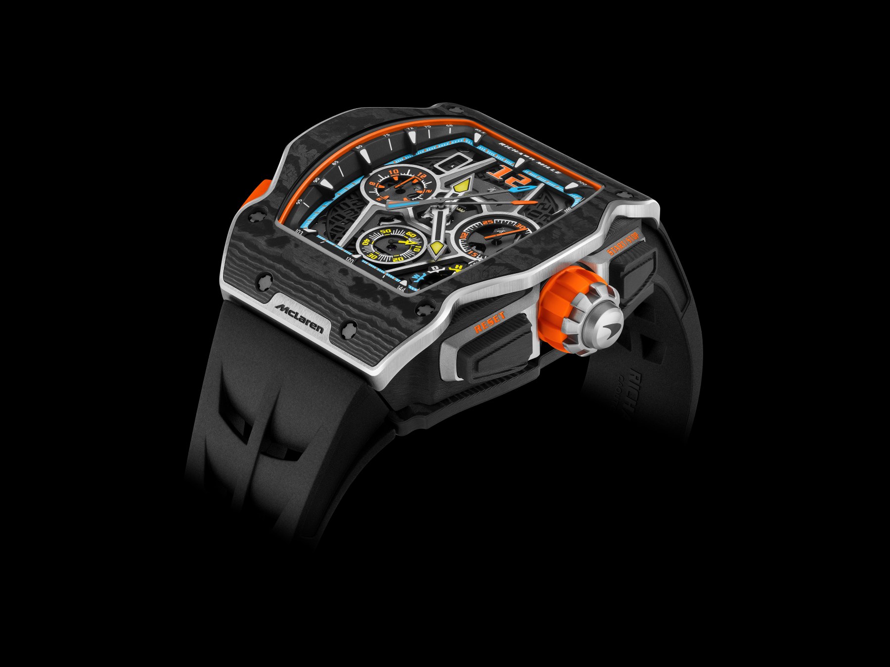 RICHARD MILLE与迈凯伦的合作始于2016年。双方合作的首款腕表RM 50-03,首次使用了加入石墨烯的Graph TPT®材料,成为当时最轻的机械陀飞轮计时码表,包括表带在内重量不到40克。