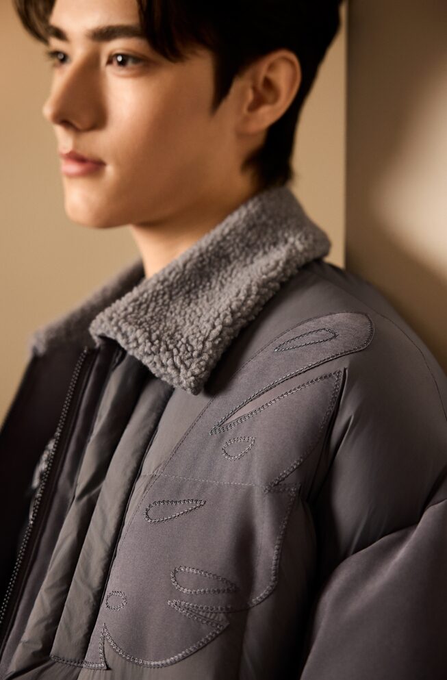 以利郎「简约男装」的品牌主张为起点,陈鹏从家乡中国景德镇柴烧陶器中寻找灵感,融合器物之美,“以绒为骨,料为肉”,以东方制造美学融合西方现代时装手法,注重材料创新与表现,将陶瓷的色彩、肌理转化为服装设计的面料、色彩和版型语言,打造联名系列“成器”胶囊系列羽绒服。