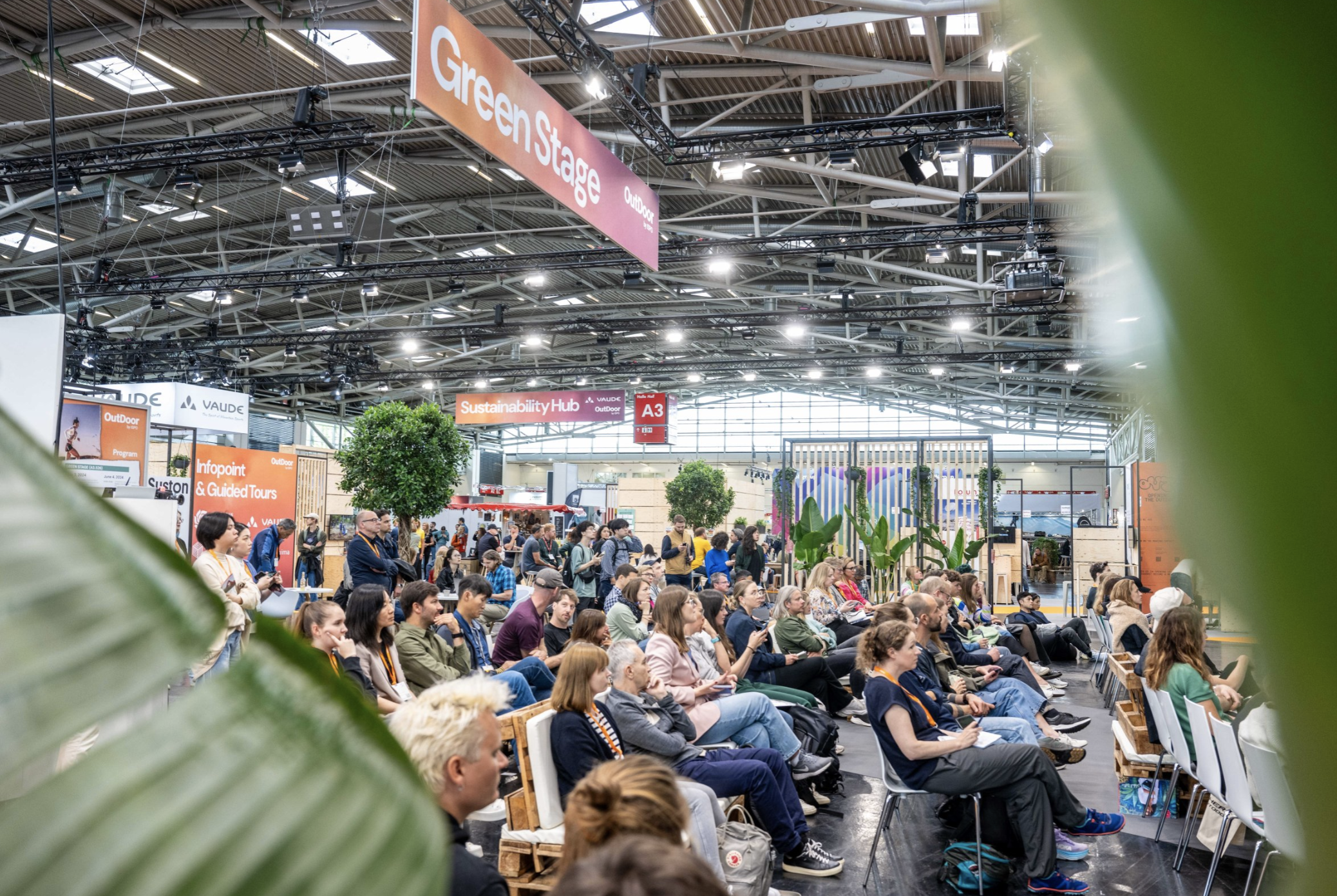 本次展会聚焦的一大重点是“可持续性”。在A3展厅中,展会主办方与德国户外服装可持续和创新供应商VAUDE合作搭建了可持续中心(Sustainability Hub)和绿色舞台(Green Stage),不仅用于展示户外可持续领域最新创新成果和趋势,还举办了多场圆桌讨论和演讲活动。参与活动的嘉宾包括政治、商业、体育等各界人士,内容覆盖观众关心的多个热点话题,包括“欧盟绿色协议(EU Green Deal)对户外公司的影响”、 “循环经济和碳减排的成功策略”、以及“新一代环保消费者的购买行为”等。