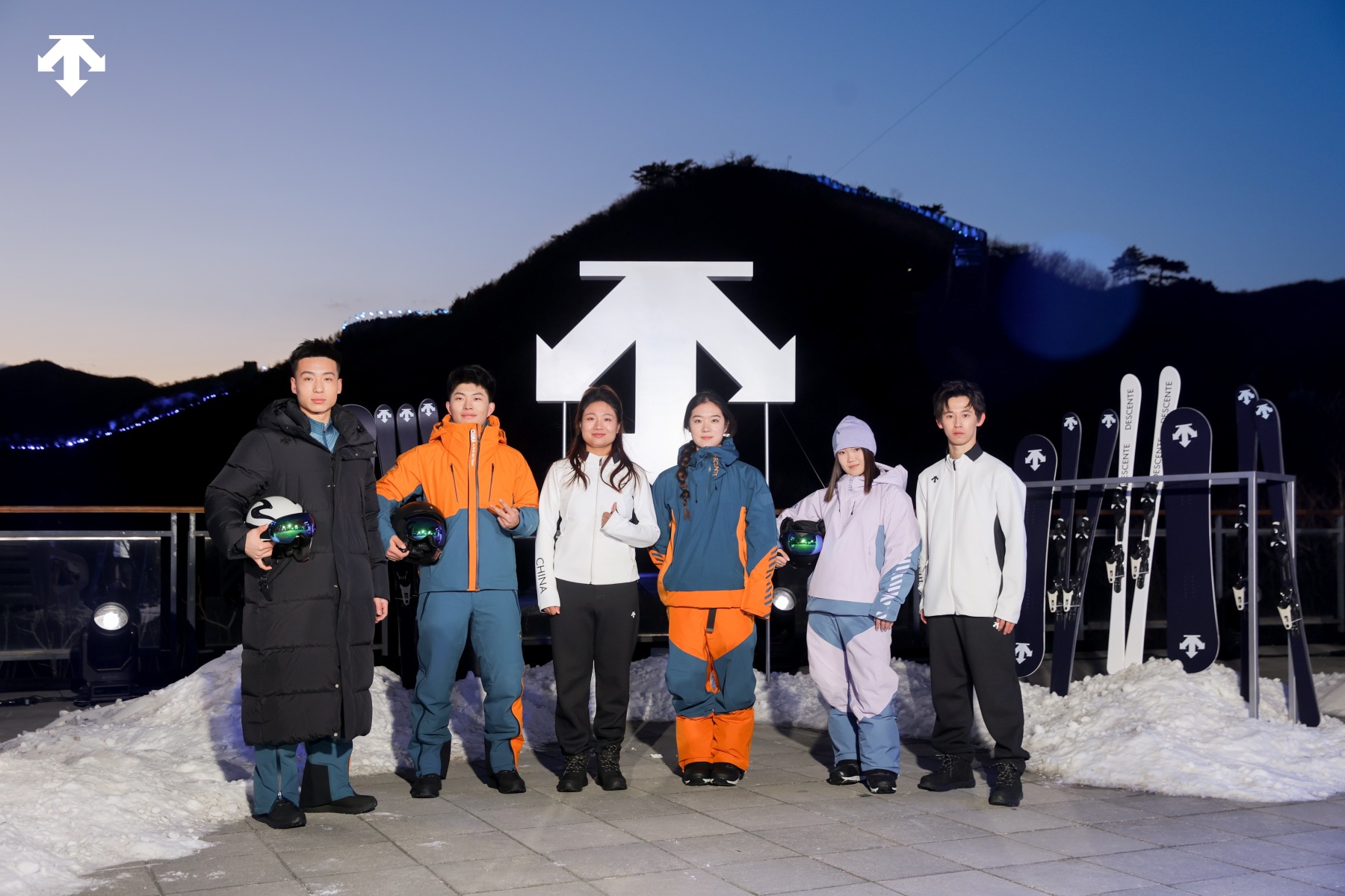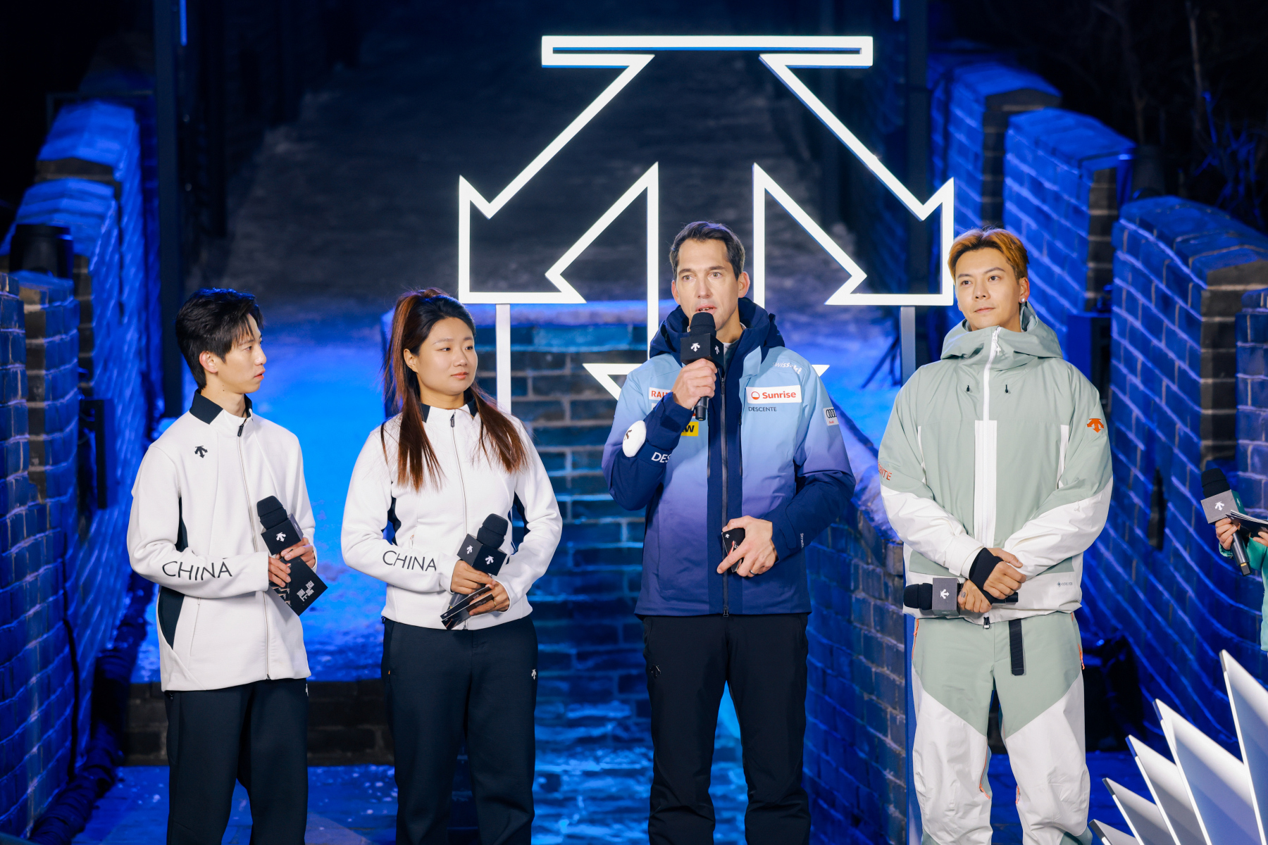 上图:迪桑特“迎峰而上”品牌发布会,中国著名高山滑雪运动员冯靖博、李博及中国著名单板滑雪运动员王晶晶、贾路路身着24秋冬国家队赞助系列亮相