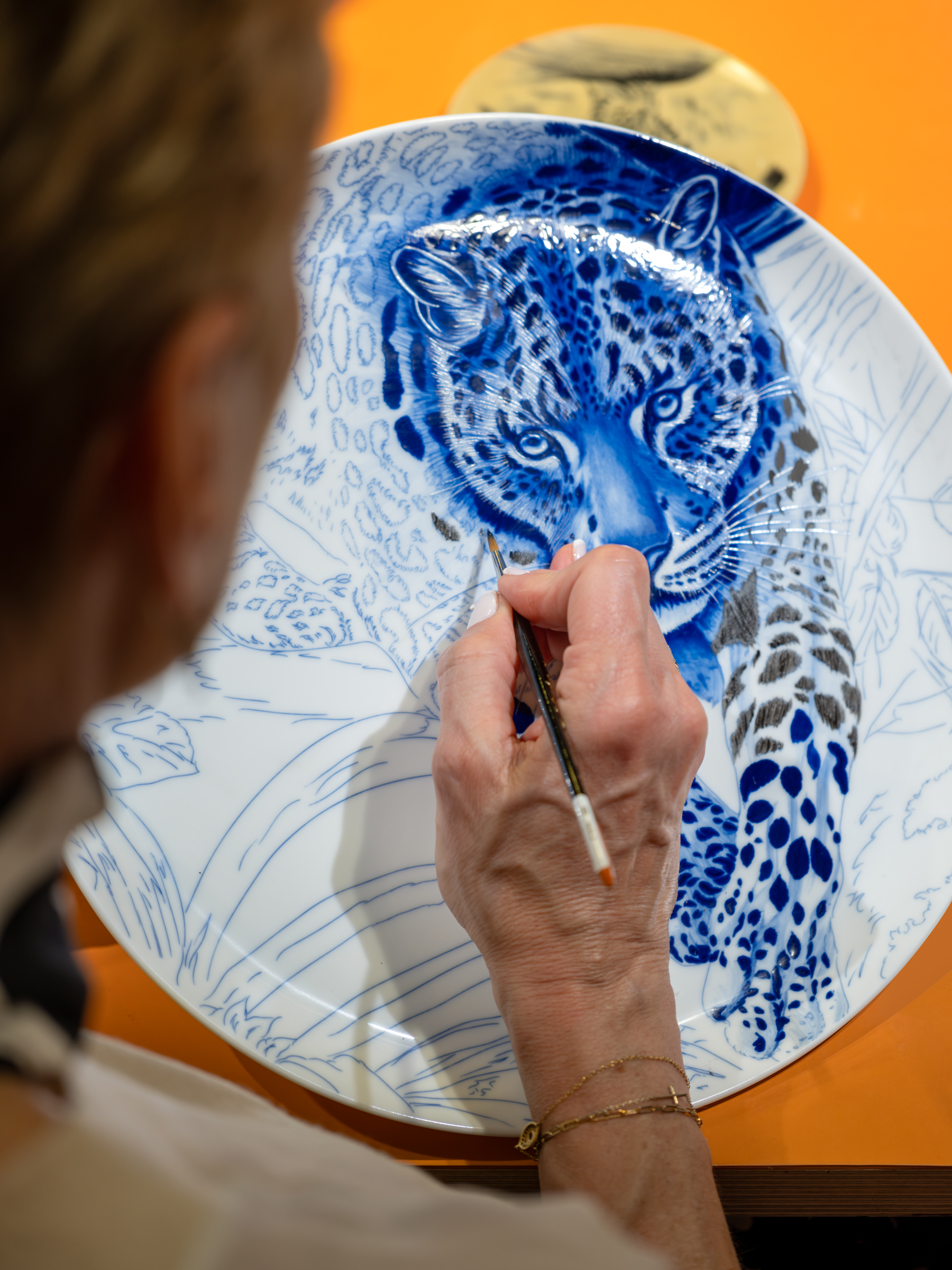 瓷器绘画是将设计或图案转移到不同尺寸和形状的优秀瓷器作品上的艺术。工匠首先使用画笔勾勒出设计的轮廓,然后填充颜色。随后进一步完善图案:使用海绵画笔将一些区域的颜色涂抹均匀,其他区域则用清漆暂时覆盖。只有在温度高达800°C的窑炉中多次烧制后,颜色的鲜艳度才得以完全展现。