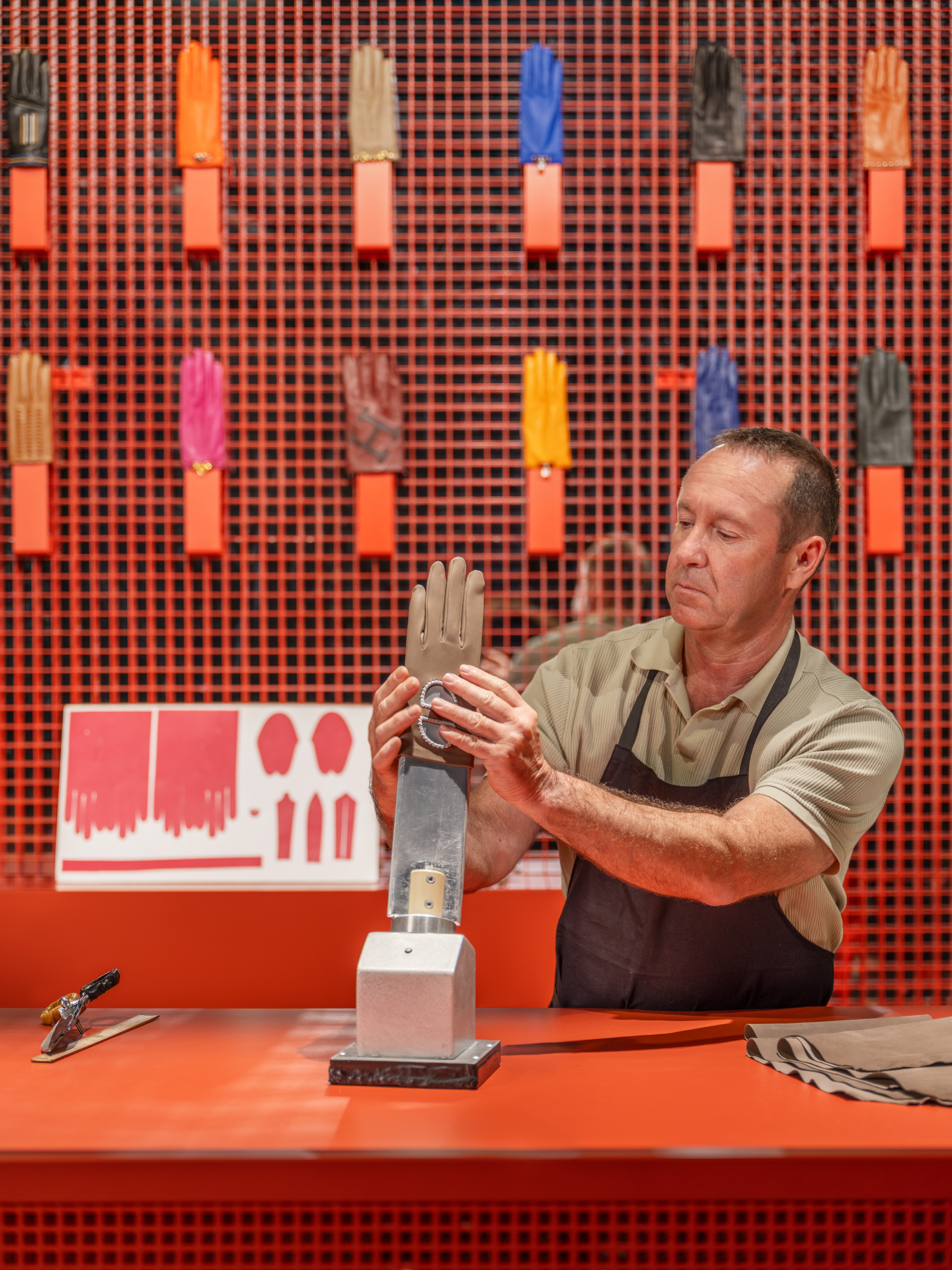 手套制作看似简单,但实际上需要经过22个步骤才能制作出最终产品。首先,手套工匠会评估皮革的质量,工匠会为手部、拇指、指间和接缝挑选不同的皮革块,并进行排料,以尽可能有效地利用材料。随后,工匠使用19世纪发明的“铁手”造型切割刀为每个手指剪裁出精确的形状。手工缝制后,手套会被套在“热手”熨斗上进行熨烫。