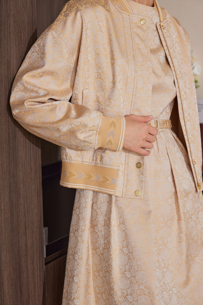 EP雅莹于2021年首次推出宋锦臻藏系列,开启了宋锦服饰的创新。2023年春夏季的宋锦真丝外套(下图)采用棒球服廓形,并在宋锦面料基础上首次加入弹力,呈现出别样活力。花纹灵感来自于宋瓷的“牡丹缠枝纹”,棒球服的领口、袖口和下摆都采用“江崖海水纹”。