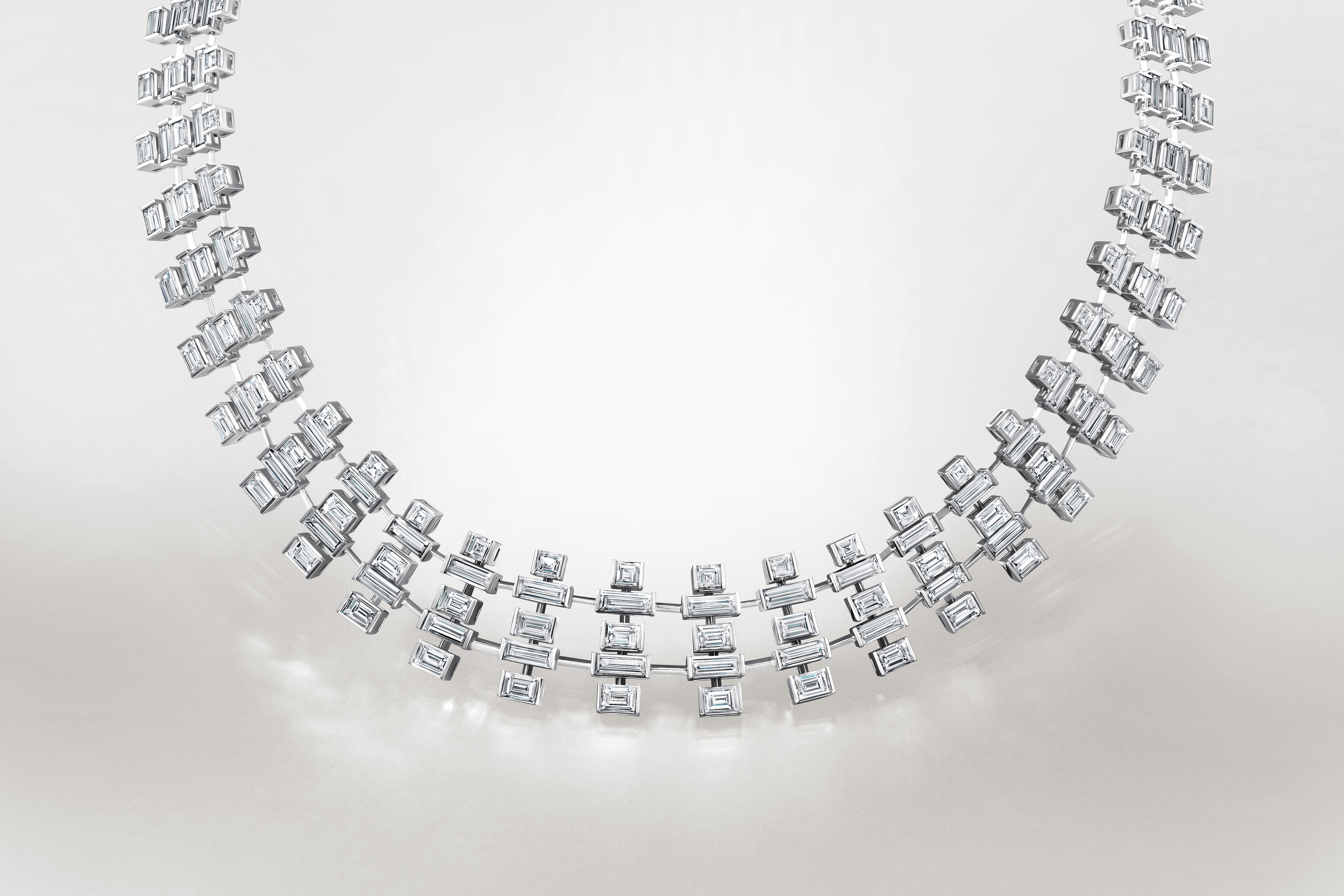 “宫宇御韵”深刻解读中国宫殿建筑美学,以珠宝为媒介,将建筑的和谐秩序通过当代设计解构诠释,赞颂宫阙神工的隽永灵韵,每件作品都是精妙建筑的微观缩影,于恢弘之中独具匠心。“宫宇御韵”聚焦宫殿建筑的核心构造,严循中轴对称之制,将台基、台阶、柱框及屋顶等层叠结构,提炼为流畅灵动的几何线条,配合精准排布镶嵌的宝石,尽显平衡对称、井然有序的大气之美。