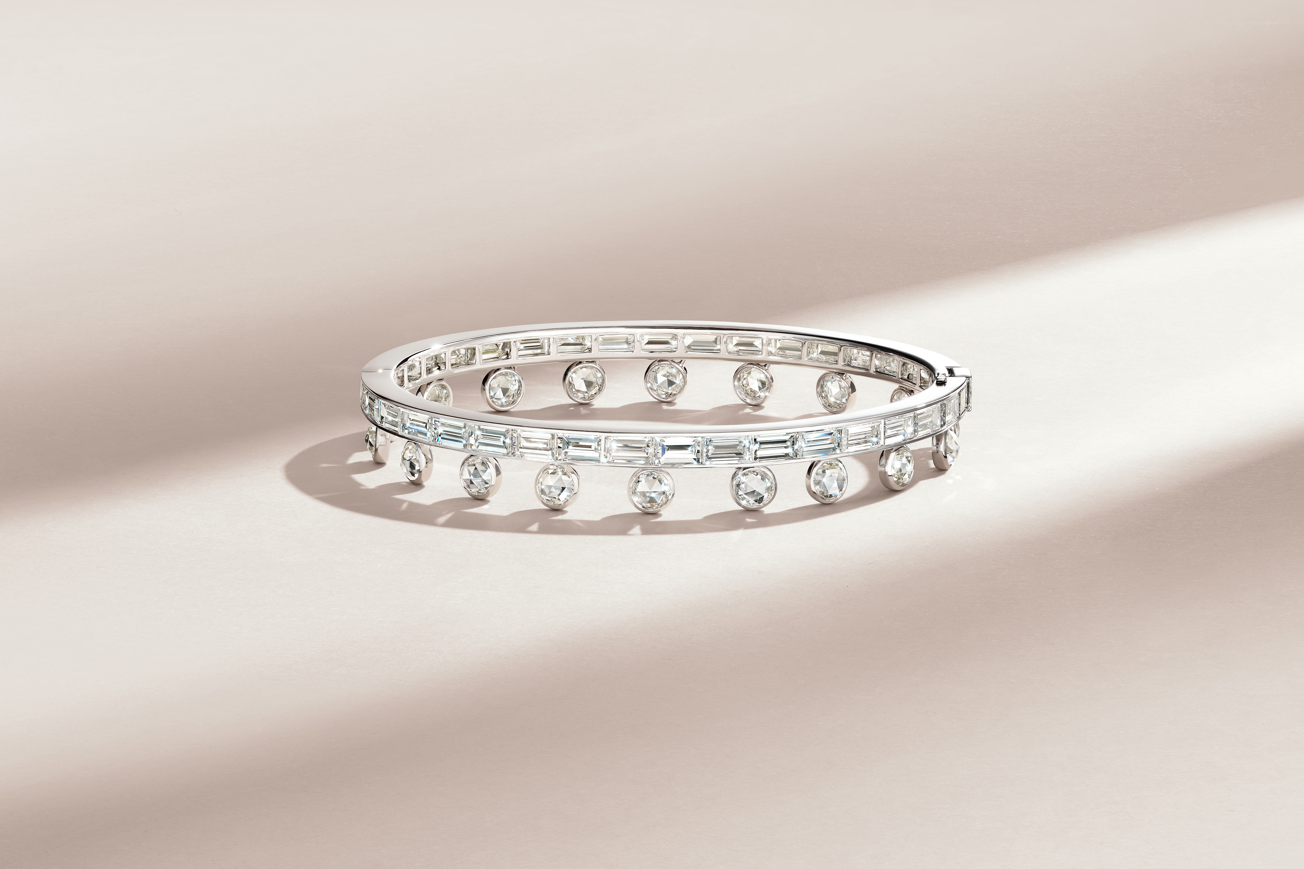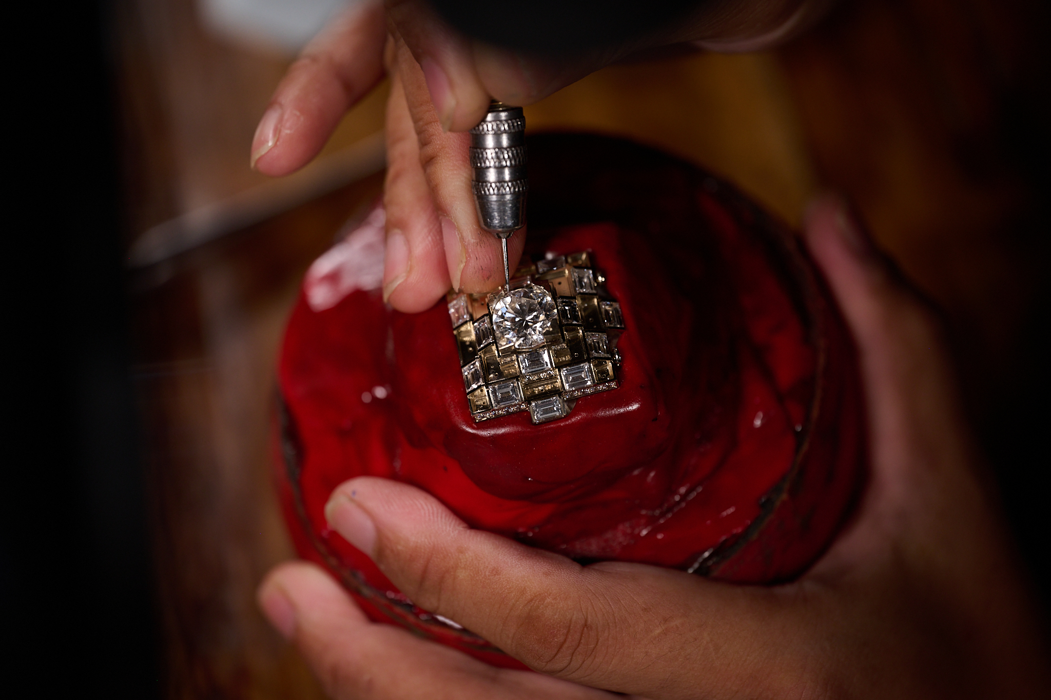 圆形钻石、珍珠与红宝石等珍贵材质,如钉饰般凸起于铂金之上,传统形制与铂金的简约现代风格交相辉映。作品融合多种精湛严苛的复杂工艺:包镶确保珠宝边线圆整,呈现极致的圆形外观;微镶令金属小爪隐于不同大小、错落排列的钻石之中;镜面抛光、水雾沙处理让璀璨光泽与哑光质感彼此映照,于光影流转间,重释“门”所承载的尊贵气韵与家宅守望的温暖哲思。