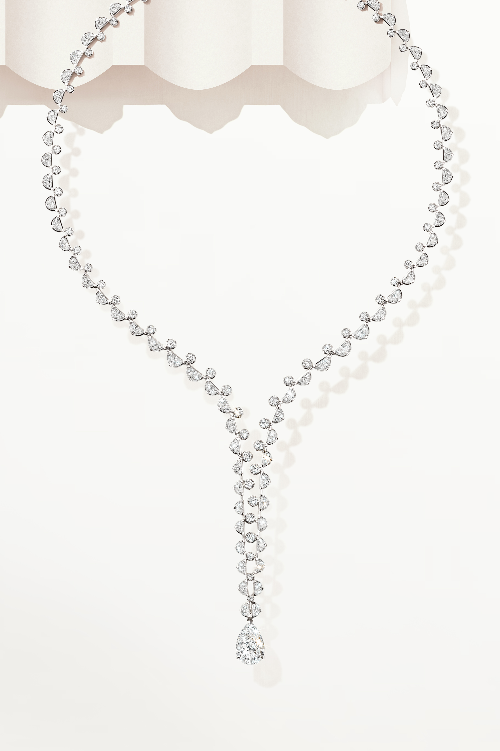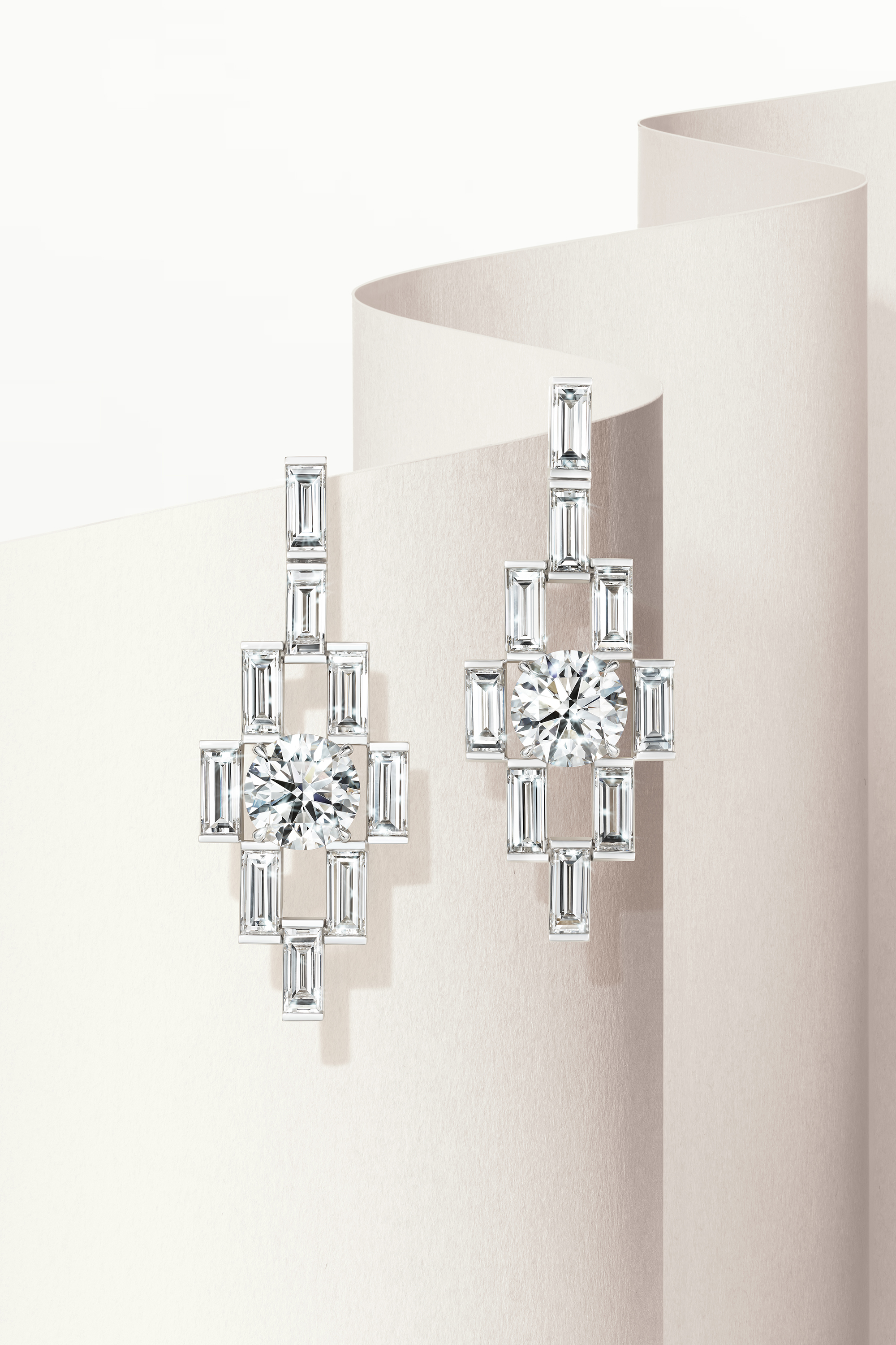 经独特切割的半月型钻石绽放迷人火彩,与圆形钻石及铂金构筑瓦的层叠韵律,如水纹游龙般舒展秩序之美。镶嵌工艺隐金属爪于无形,极致呈现半月造型的纯粹线条,还原似瓦滴水的意境;镜面打磨赋予钻石熠熠华光,金脊边迫镶的长方型钻石精巧璀璨,于简素中见雅致,于细节处显匠心。