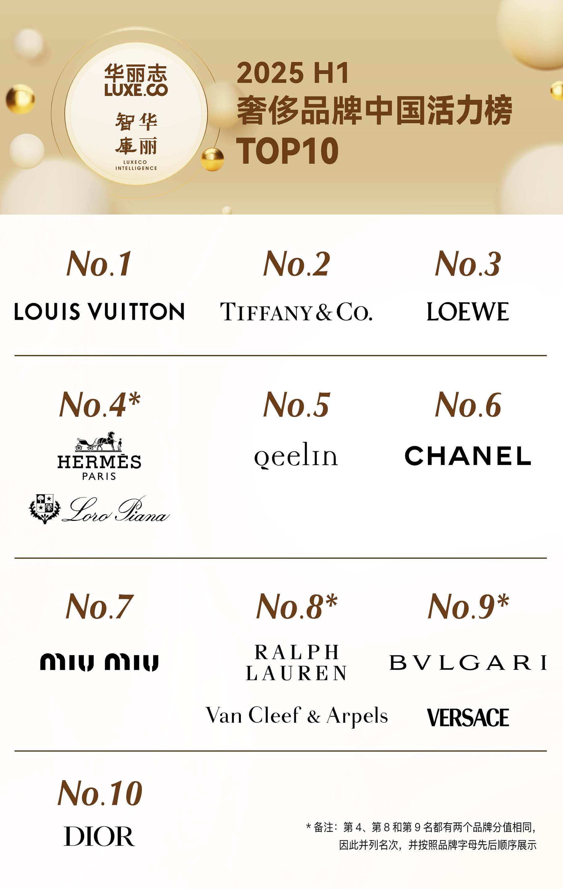 Ralph Lauren拉夫劳伦,Loro Piana诺悠翩雅,Qeelin麒麟,MiuMiu缪缪,Van Cleef & Arpels梵克雅宝。