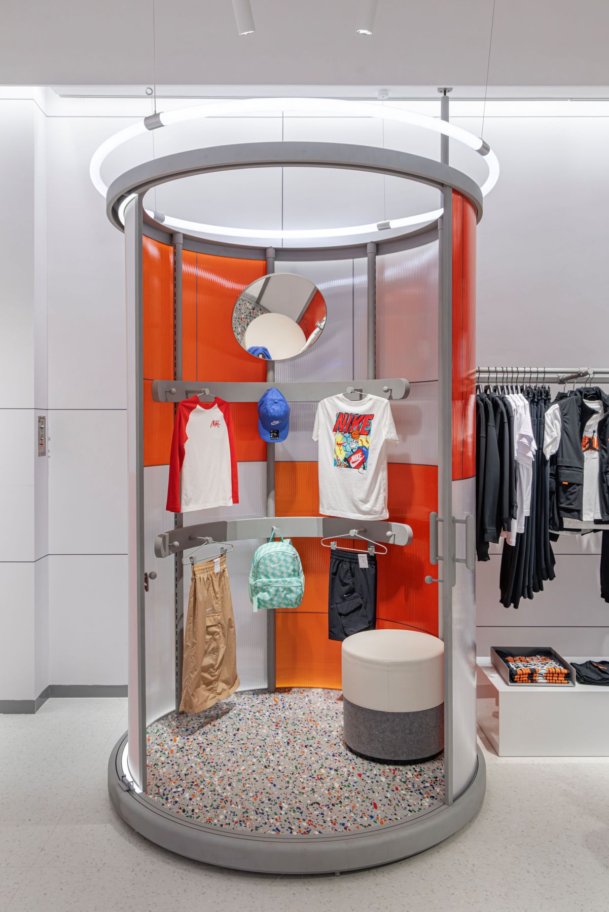 上图:传统试衣间被放到了前场。耐克儿童观察到孩子们常常抗拒独自在封闭的空间内试衣,前场的半开放试衣间能让他们在感受上更自如,与家长互动更密切。