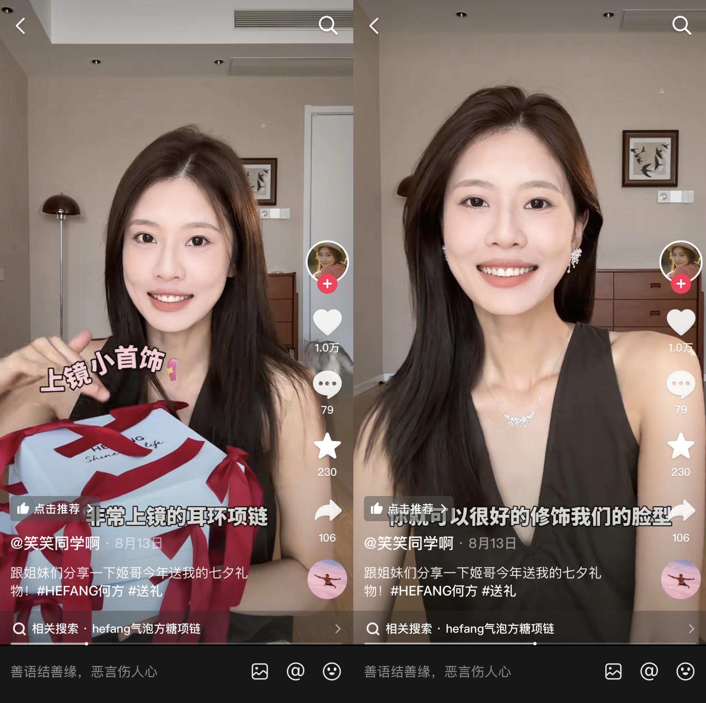上图:博主@笑笑同学啊 则分享了男友今年选择HEFANG首饰作为七夕礼物,描绘了甜蜜的“礼赠”场景。她与男友节日互送礼物保持仪式感,选礼倾向实用又有心意。