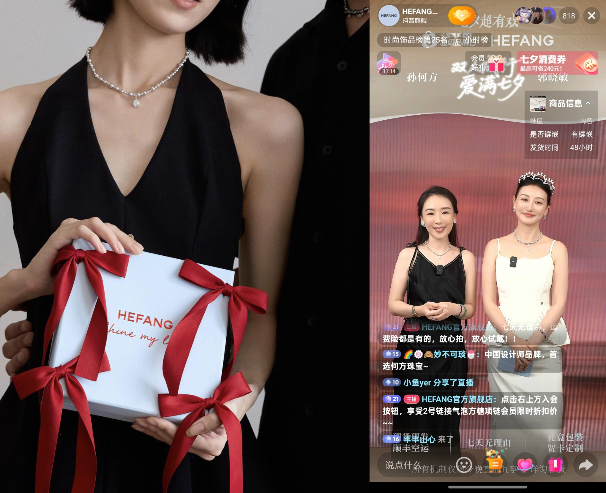 HEFANG则采用“总裁×明星双进播”模式,打造了看展、派对、约会、度假下班、运动五大场景,结合趣味问答、送礼推荐和专业珠宝搭配分享,兼顾了直播内容的专业性与娱乐感,直播大场当日GMV实现230%的环比增长,七夕周期品牌总人群资产环比增长175%。
