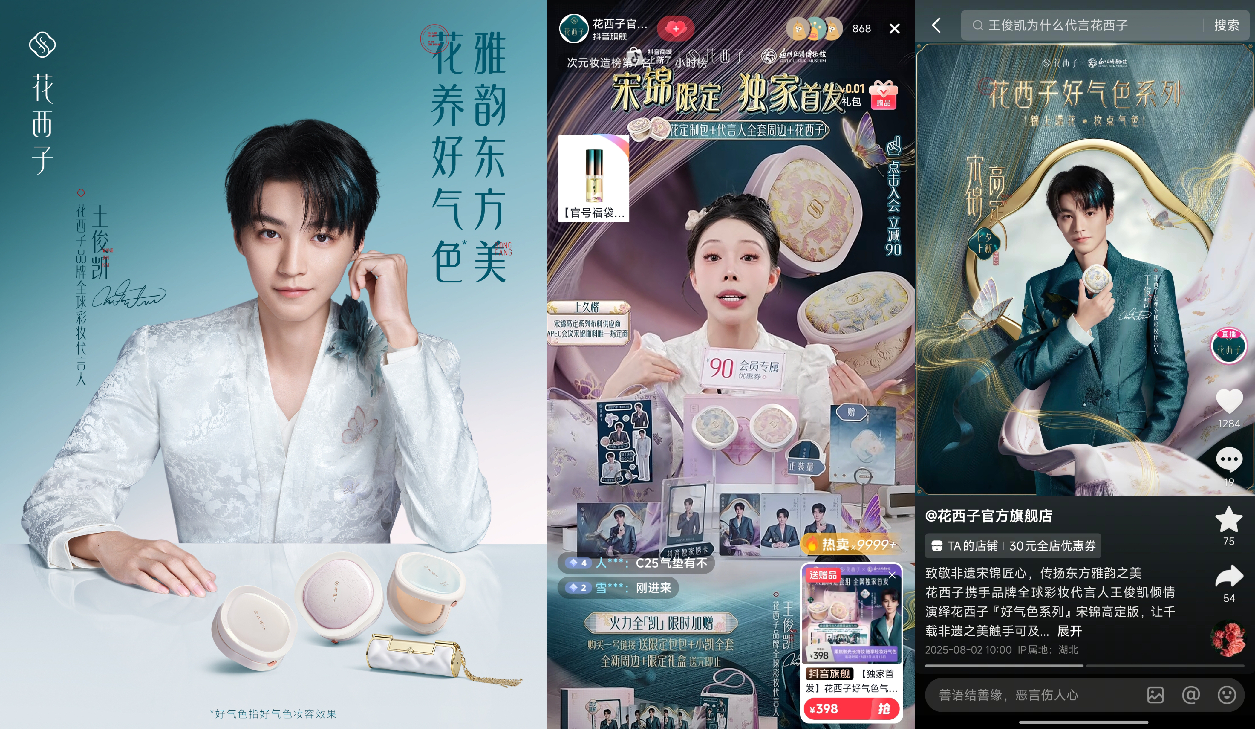 花西子于2025年7月官宣王俊凯成为品牌全球彩妆代言人,并以此为契机,结合宋锦高定系列新品上市,以抖音为核心阵地开展多触点、多层次整合营销。
