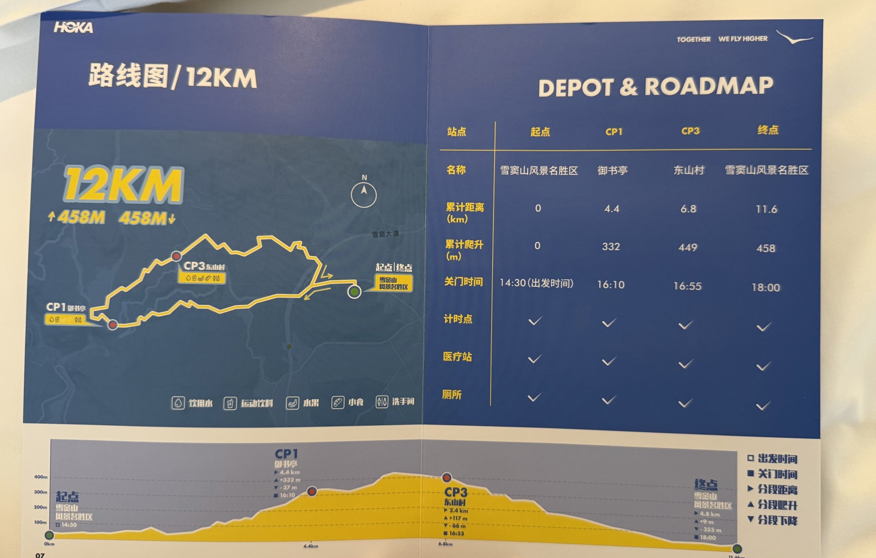 - 12公里组爬升458米,路线平缓、节奏舒适,是“首野”跑者开启山野之旅的友好选择(上图为HOKA赛事手册路线页)