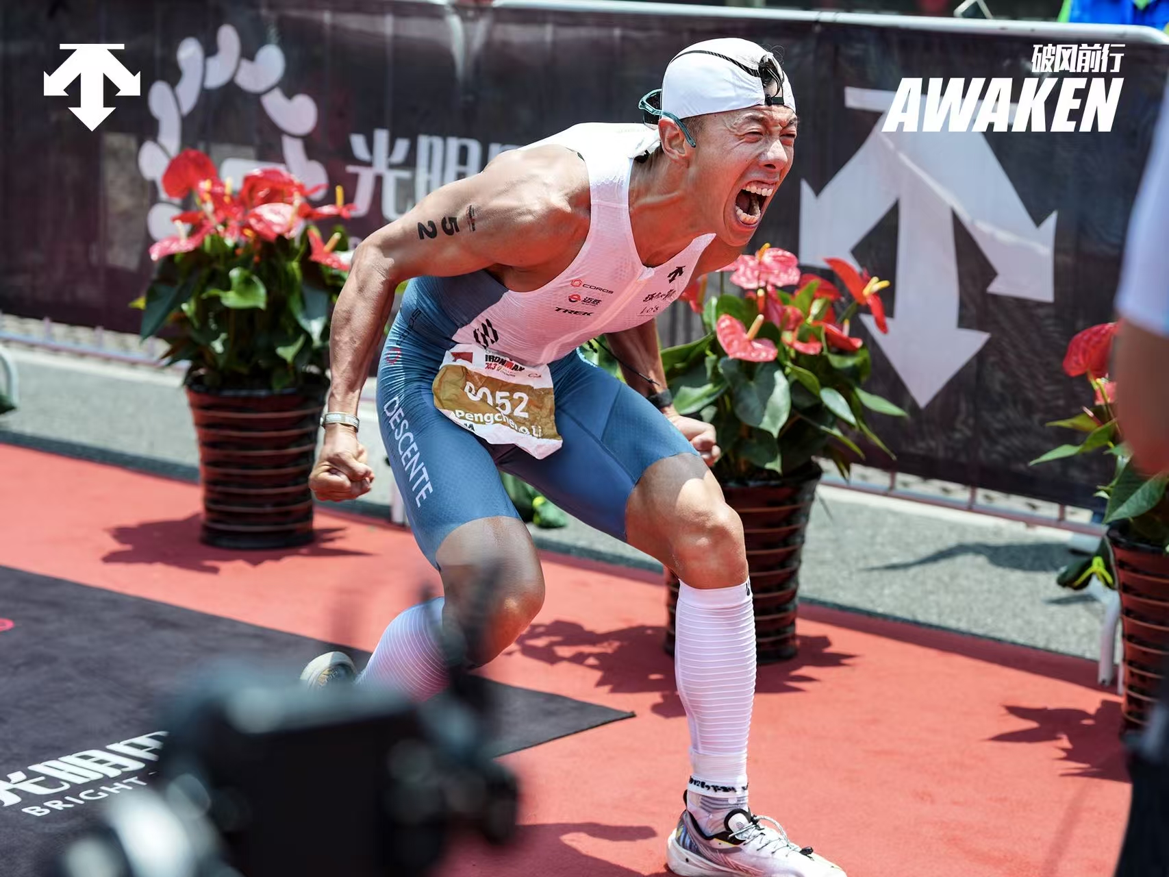 上图:IRONMAN 70.3上海站,迪桑特品牌铁三大使巴斯(李鹏程)打破中国纪录获得年龄组总冠军