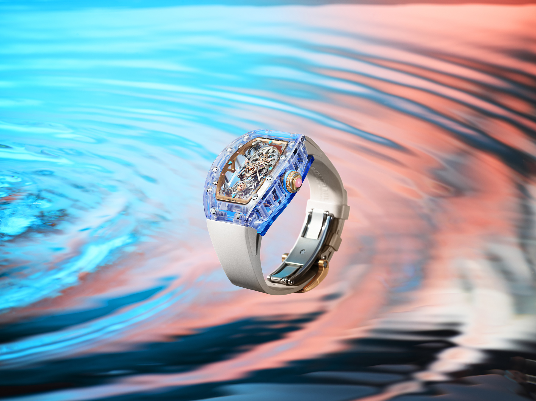 RM 75-01还推出了彩色蓝宝石水晶版本。彩色蓝宝石的工艺远比透明蓝宝石更为严苛,其原理在于晶体结构中融入金属氧化物,添加量须格外精准,它影响了彩色蓝宝石水晶的成色。